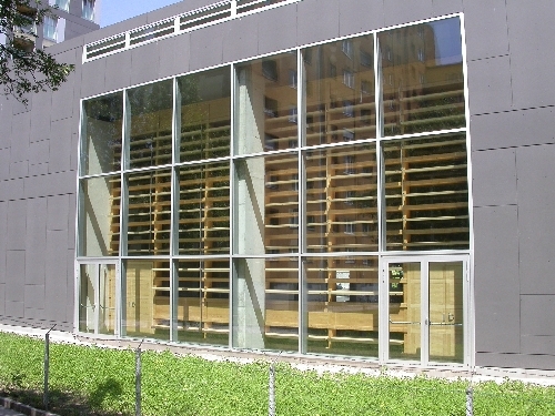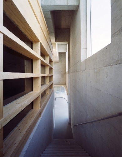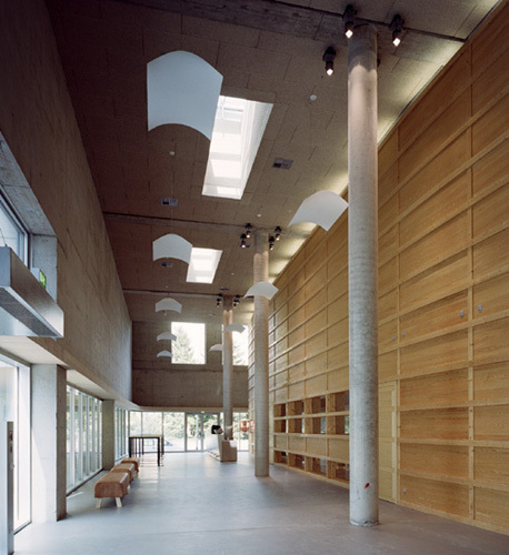 Tageslicht kommt durch eine raumhohe Südverglasung über einen Wintergarten und schwenkbare Wandelemente kontrolliert in den Saal. Zwei einander gegenüber liegende, an den Schmalseiten angeordnete, raumhohe Sichtbetonscheiben wirken einerseits als konstruktives Rückgrat, andererseits als akustisch wirksame Reflektoren. Je nach Anforderung kann die Wirksamkeit dieser Reflektoren mittels verschiebbarer Samtvorhänge gesteuert werden. Eine spezifische Gestaltung der Decke ermöglicht es, die gesamte Technik auszublenden. Dieses, an Schwemmholz erinnernde, Deckenbild spiegelt sich in der Bodengestaltung wider. (Text: nach einem Text der Architekten)