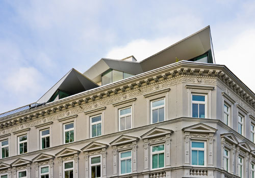 Die Arbeit fing im Keller an. Eine neue Fundamentplatte musste eingebaut werden. „Es war sehr viel zu tun“, erinnert sich Michael Buchleitner. An die 10.000 Arbeitsstunden investierten die beiden lakonis architekten ins eigene Haus. Das Büro, das im Erdgeschoß angesiedelt werden sollte, bekam einen hofseitigen Zubau. Zudem wurden einige der bestehenden Wohnungen komplett saniert. „Das Alte mit Respekt zu behandeln war uns sehr wichtig“, sagen die beiden Architekten. Zur Rundum-Erneuerung zählte daher auch die Restaurierung der Stuckfassade sowie der Einbau neuer Fenster.
