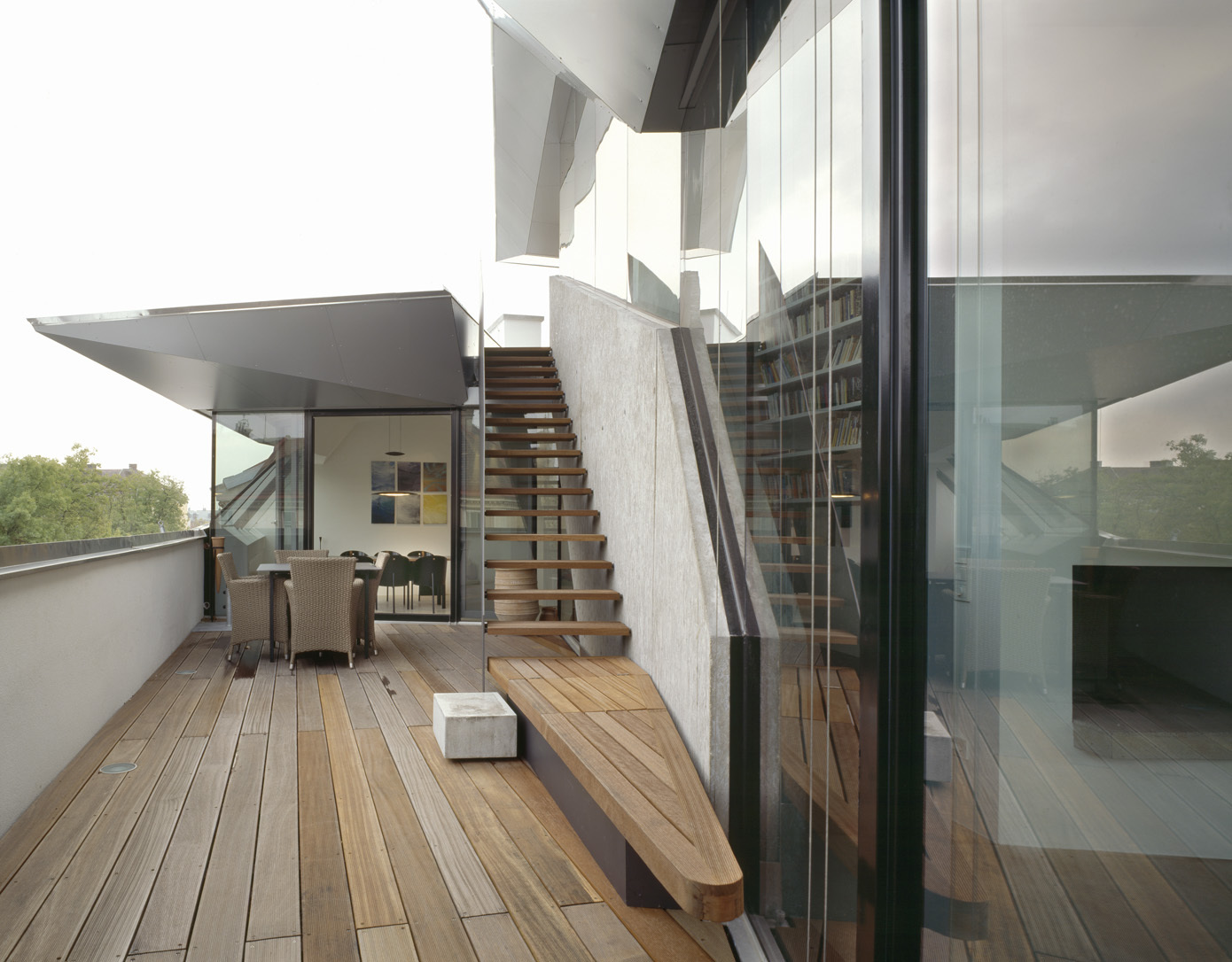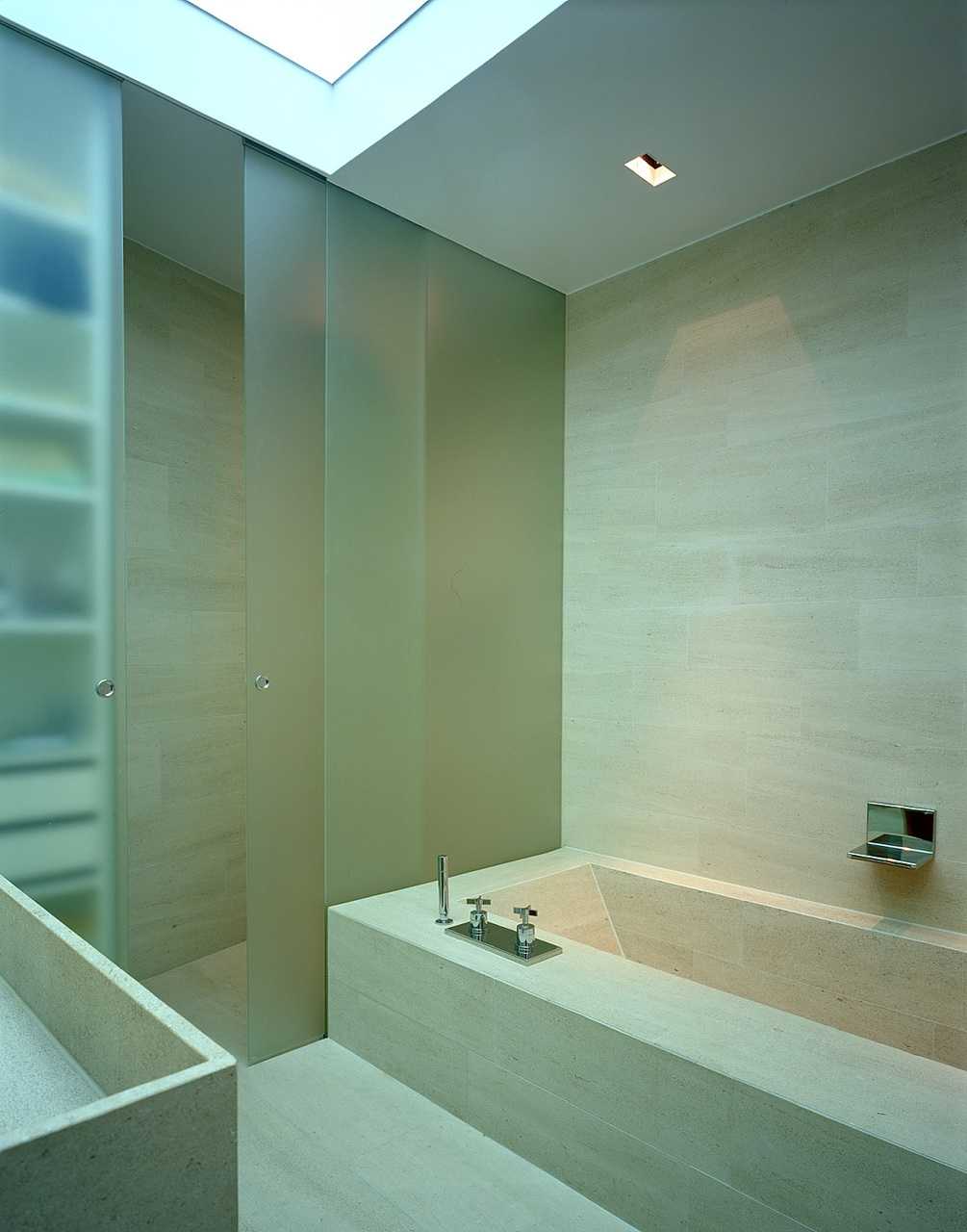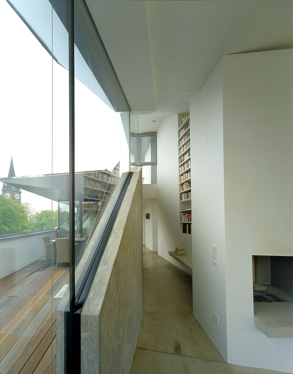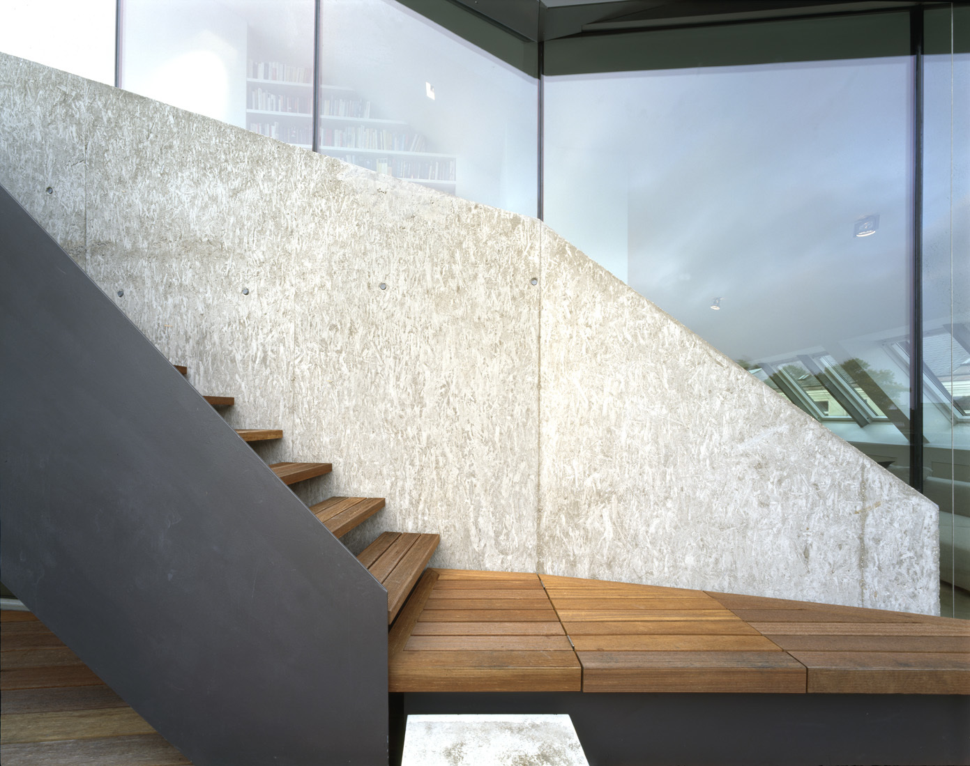 Die Materialwahl ist puristisch, wie es sich für Architekten gehört: Beton, Stahlblech und ein wenig Holz zur Herzerwärmung. Die natürliche Belichtung ist der jeweiligen Nutzung angepasst. Während die straßenseitigen Wohnräume mittels eines Fensterbandes entlang der Traufe belichtet werden, nimmt die Helligkeit in den Privaträumen stark ab. Im Schlafzimmer fällt die Sonne von oben in den Raum, im überaus luxuriösen Badezimmer aus Kalkstein gibt es nur noch künstliche Beleuchtung: Eine Lichtdecke öffnet den zweieinhalb Meter hohen Baderaum und vermittelt einem das Gefühl von Unendlichkeit.