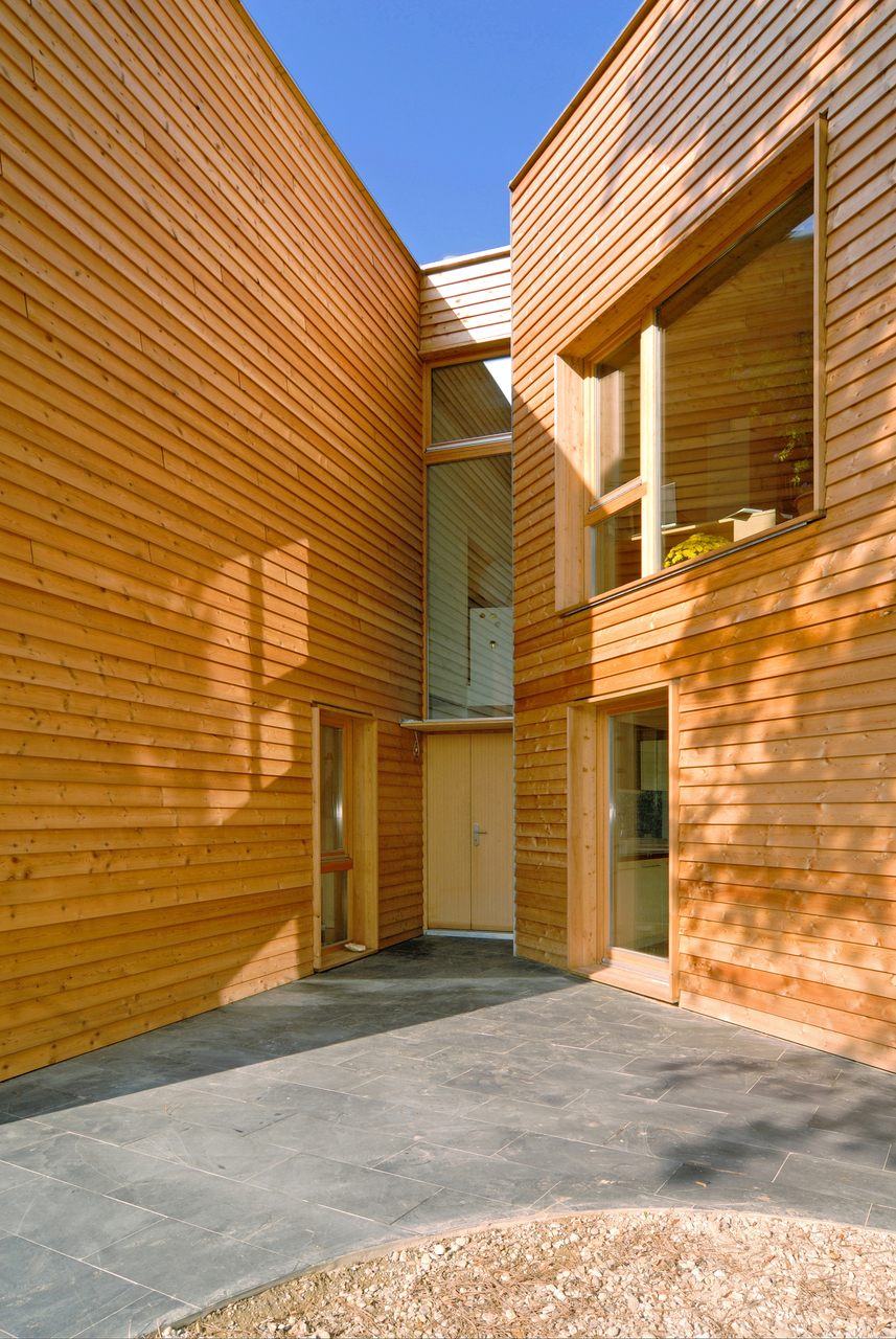 „Ich habe mir ein Holzhaus gewünscht, das im Laufe der Zeit eine Patina bekommt“, sagt die Baufrau. Wie an einer Klamm schreitet man die lärchenverkleidete Fassade entlang. Keck lugt rechts die schräge Wand des Elternbades vor. In der Tiefe des dunklen Hausecks ruht das Schlafzimmer, durch ein Fenster blinzelt zwischen den Bäumen die Morgensonne herein.