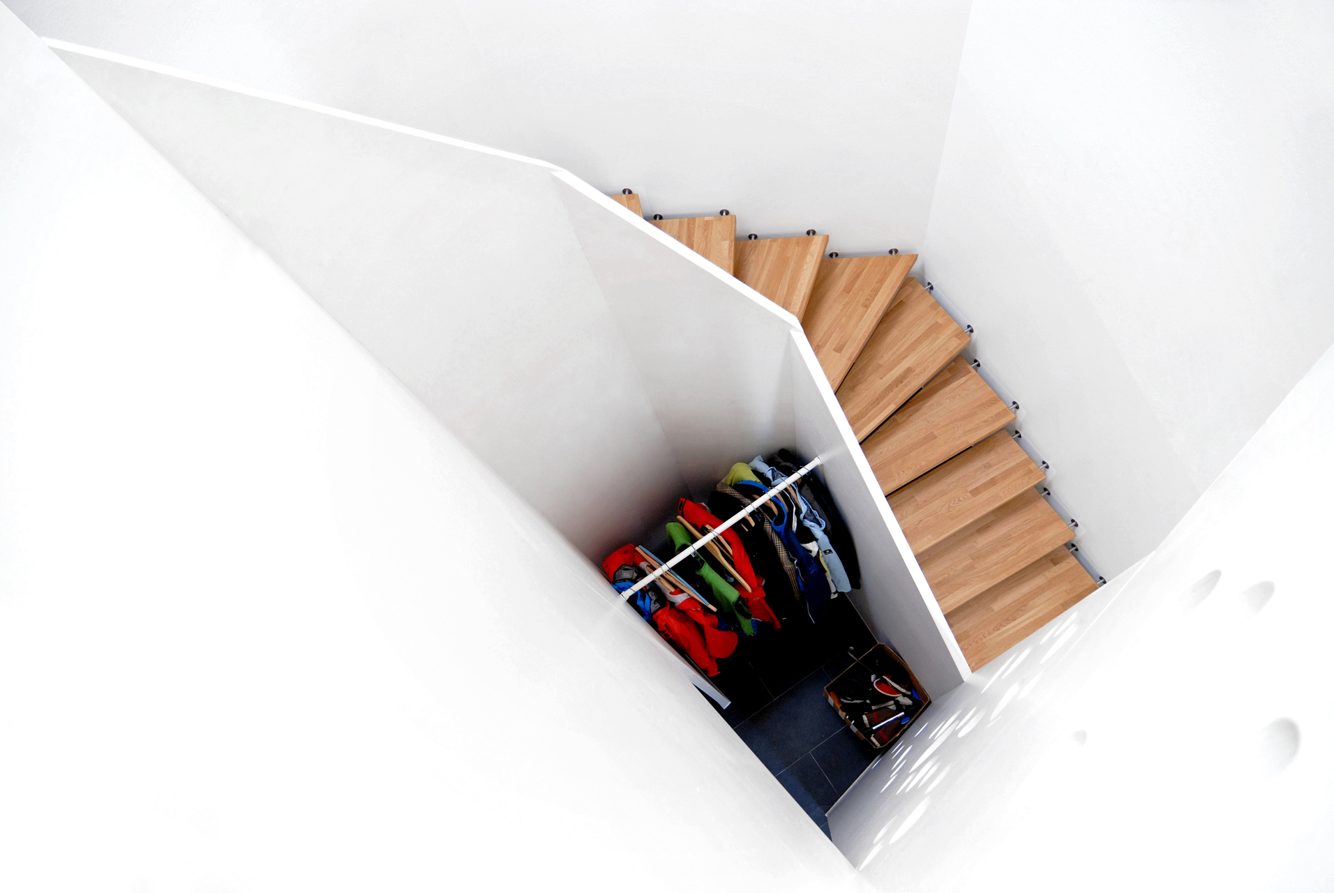 Schöne Lichtstimmung auch im Foyer: Durch einen fast haushohen Glasstreifen fallen Sonne, Himmel und Föhrenwipfel in den Raum. Wie eine Skulptur klettert die Treppe über die Garderobe und windet sich ums Atrium. „Das Licht von oben ist wunderbar“, schwärmt die Baufrau, „wenn es regnet, ist es besonders schön.“ Ein Hingucker ist jedenfalls die Brüstung im Stiegenhaus: Die massive Wand ist mit ovalen Löchern perforiert.