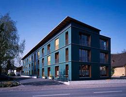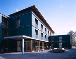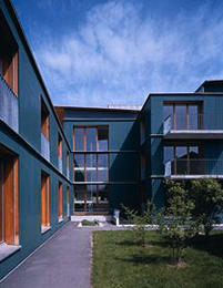 Der parallel geschichtete Baukörper ermöglicht das effizientere Einpassen des grossen Bauvolumens von rund 18000 m³. Die einzelnen Gebäudeschichten sind modular aufgebaut und erlauben eine grosse Flexibilität der Nutzungsanordnungen. Die Fassade mit lediglich einem Fenstertyp in regelmässigem Rhythmus bindet die einzelnen Gebäudeteile zusammen. Französche Balkone ersetzen aus Kostengründen individuelle Balkone. Die raumhohen Fenster sind als Blendrahmen innen angeschlagen. Die Flügel können 180 Grad umgeschlagen werden; damit können die Erschließungszonen im Sommer als offene Veranden genutzt werden.