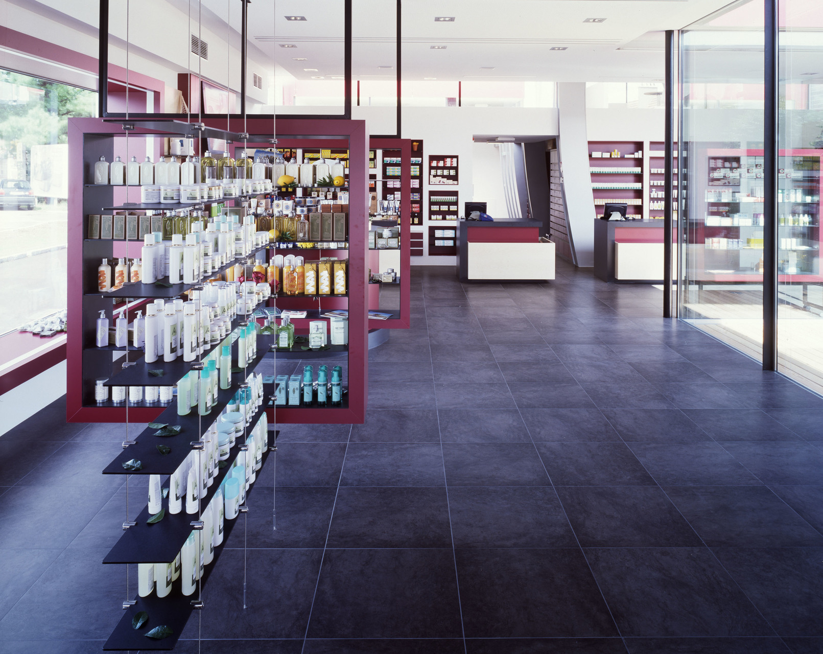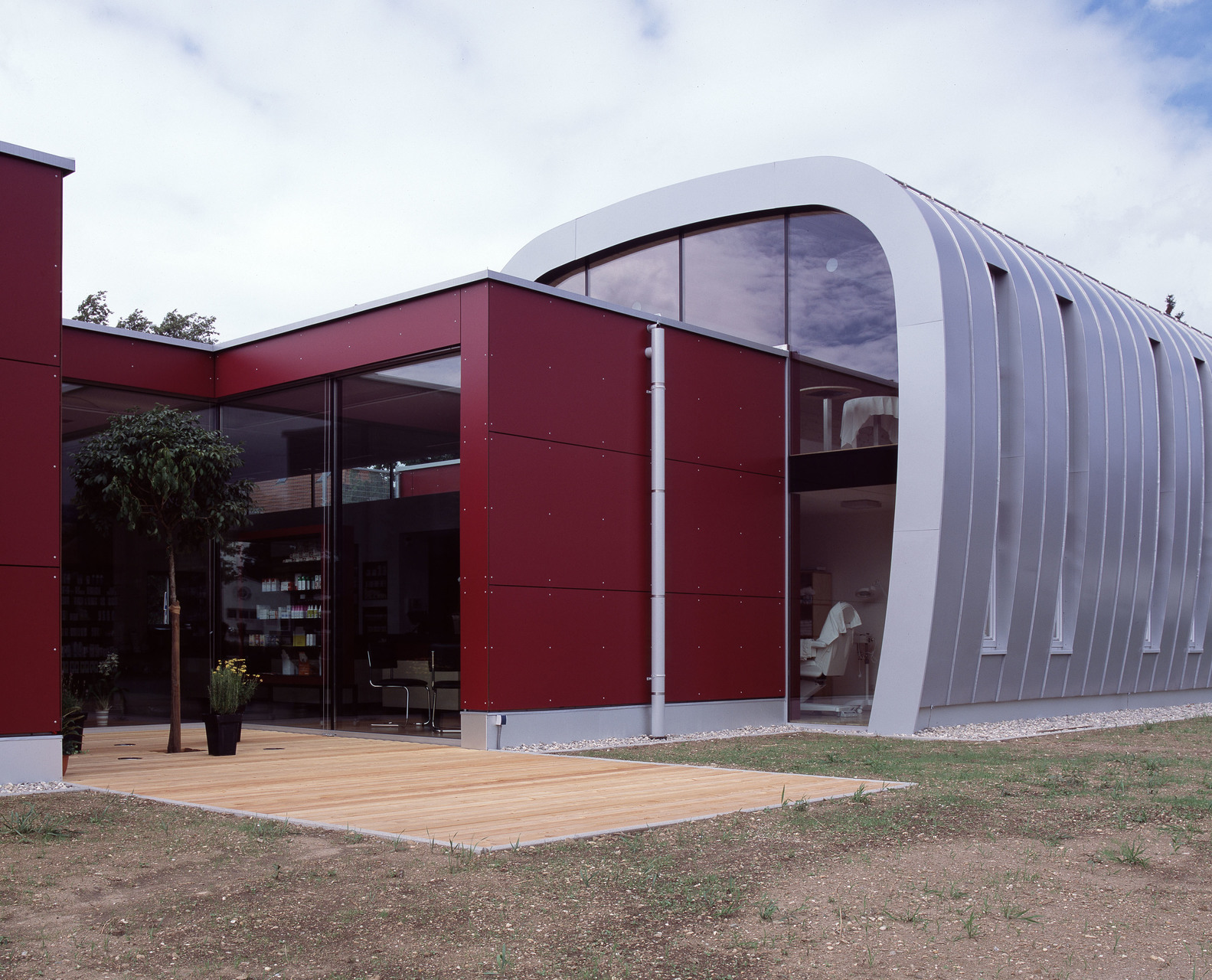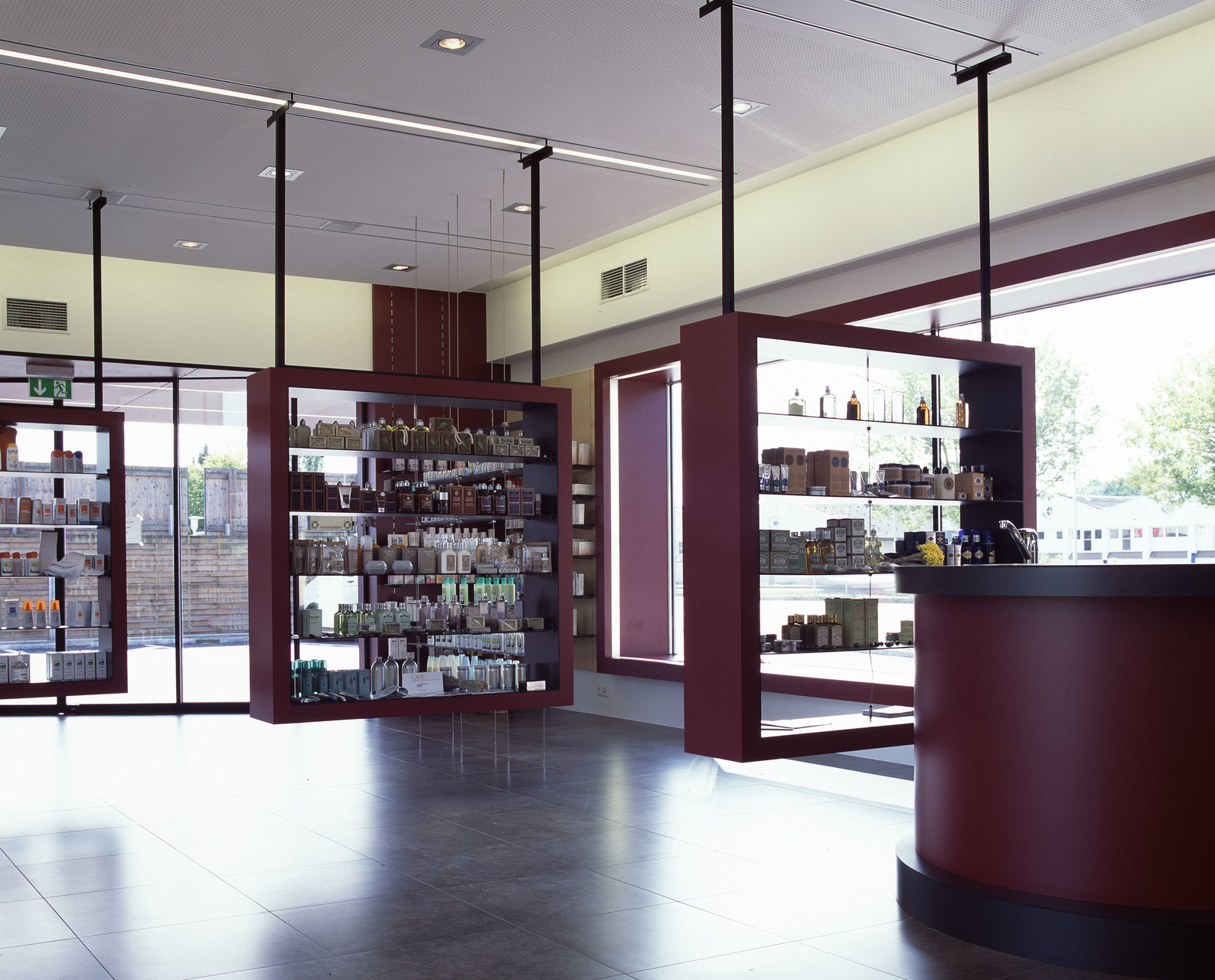 Eingangsbereich ist durch einen Ausschnitt aus der Grundkubatur geformt. Im hinteren Gebäudeteil bekommen die unterschiedlichen Funktionseinheiten eigene, auch im Material sich spiegelnde Volumina: zur Straße hin der Lager und Laborbereich als schwarze Box, der ruhigen Rückseite zugewandt der schiffartige Bauchraum in Blech und Holz mit den intimeren Kundenbereichen – Kosmetik und Massage, dem Büro und im Obergeschoss einem funktionsoffenen Raum für unterschiedliche Nutzungen wie Vorträge, Seminare, Gymnastik, Yoga, etc. Diese verschiedenen, sich im und über dem roten Grundkörper vereinigenden Kubaturen sind von innen gleichermaßen wie von außen – besonders durch das Spiel mit Oberlichten und Transparenzen – wahrnehmbar.