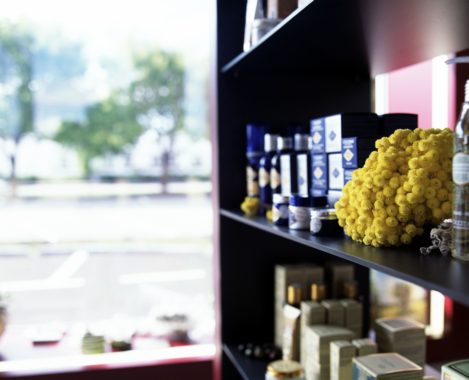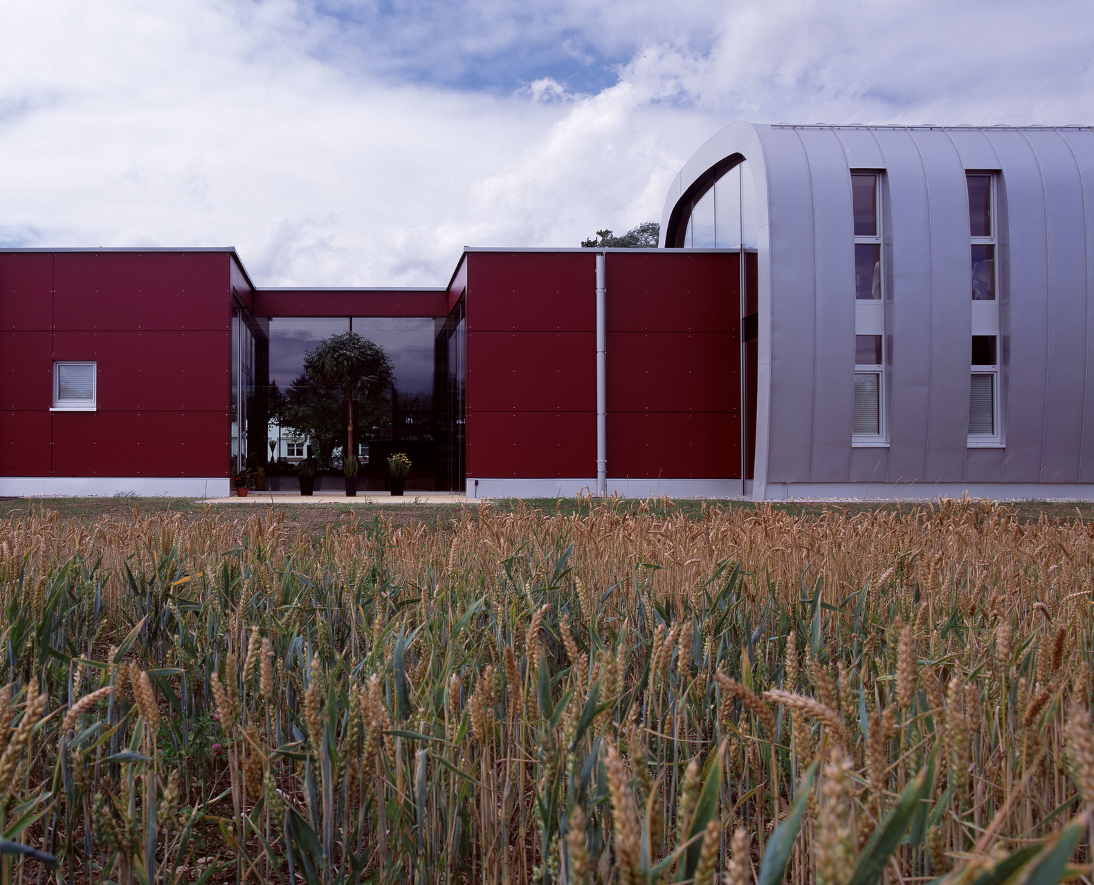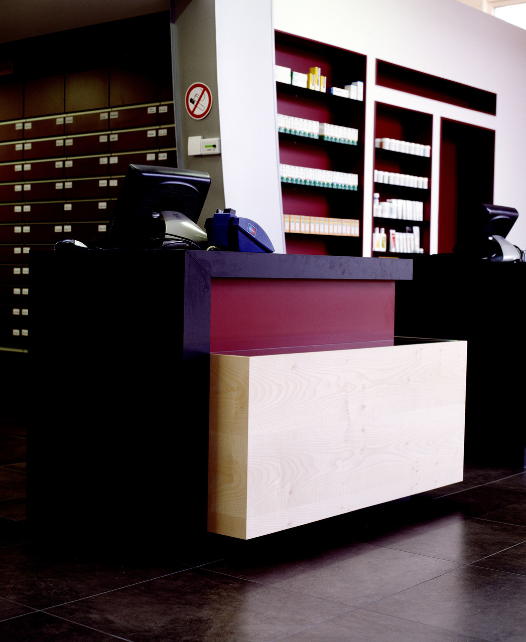 Eingangsbereich ist durch einen Ausschnitt aus der Grundkubatur geformt. Im hinteren Gebäudeteil bekommen die unterschiedlichen Funktionseinheiten eigene, auch im Material sich spiegelnde Volumina: zur Straße hin der Lager und Laborbereich als schwarze Box, der ruhigen Rückseite zugewandt der schiffartige Bauchraum in Blech und Holz mit den intimeren Kundenbereichen – Kosmetik und Massage, dem Büro und im Obergeschoss einem funktionsoffenen Raum für unterschiedliche Nutzungen wie Vorträge, Seminare, Gymnastik, Yoga, etc. Diese verschiedenen, sich im und über dem roten Grundkörper vereinigenden Kubaturen sind von innen gleichermaßen wie von außen – besonders durch das Spiel mit Oberlichten und Transparenzen – wahrnehmbar.