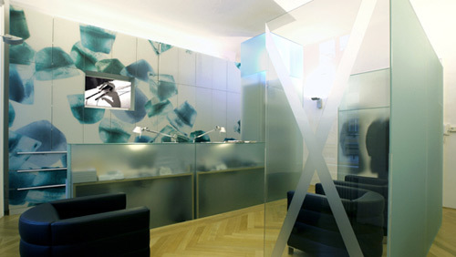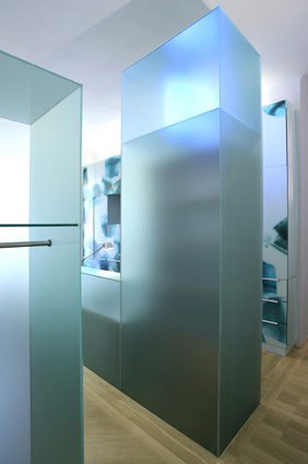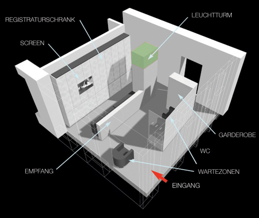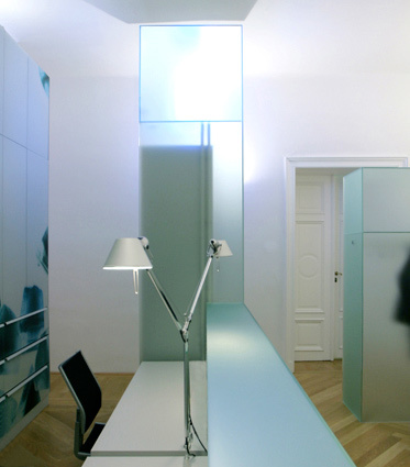 Wohlgeordnete (räumliche) Verhältnisse? Für eine Anwaltskanzlei ist das Bedürfnis nach „Law & Order“ wohl mehr als eine private Obsession. Die Eingangssituation des Büros eines Rechtsberaterunternehmens in Wien-Innere Stadt wurde neu definiert, um zwischen internen Wegen und Klientenbereich eine klare Trennung zu schaffen.Zwei Empfangsdesks mit Registraturschrankwand, Garderobe und Wartebereich definieren den Kundenbereich, ein sogenannter „Leuchtturm“ markiert den Übergang zu den internen Kanzleiräumlichkeiten. Dieser Leuchtturm ist jedoch kein statisches (unbewegtes und unauffälliges) Element im Raum, sondern verfärbt sich verlaufend - getreu nach den gesetzen de RGB-Spektrums - und wird somit zum attraktiven Orientierungspunkt. (Text: Gabriele Kaiser)