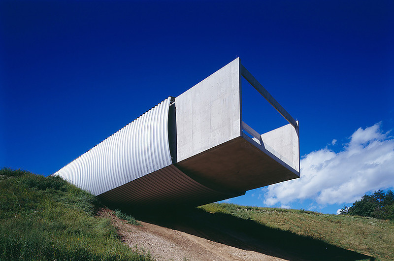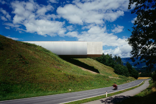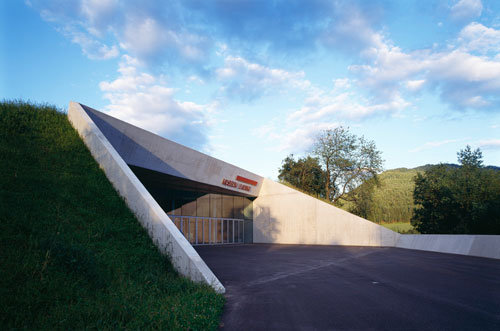 Nicht nur die Raumqualität, auch die ungewöhnliche Entscheidung, die Architektur in die Erde einzugraben und nur an ein paar Ecken ans Tageslicht treten zu lassen, machten den Bau zur Ikone. Das einprägsame Bild der stahlbekleideten Betonröhre, die aus dem Hang über die Bundesstraße B81 zischt, schaffte es als reduzierte Strichzeichnung sogar auf eine Briefmarke – in prominenter Gesellschaft mit dem Kunsthaus Bregenz (Peter Zumthor), dem Kunsthaus Graz (Peter Cook und Colin Fournier), dem Lentos Kunstmuseum in Linz (Weber & Hofer Architekten) und dem Schindler House in Los Angeles (Rudolph Schindler).
