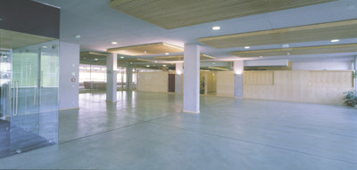 Vom Seniorenheim bis zur bestehenden Volksschule spannt sich ein zentraler fußläufiger Platz, an dem Ökohauptschule und Dreifachturnhalle liegen. Als achsiales Verbindungselement dient ein überdachter Gang, der eine wettergeschützte Verbindung zwischen den Bauteilen als auch die Zugangsschwelle zu den südwestlich anschließenden Freisportflächen darstellt.