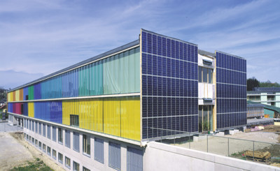 Die Turnhalle ist direkt an den Baukörper der Schule gekoppelt und erlaubt so Durchblicke von Aula und Garderobe zu Tribüne und Sporthalle. In den Obergeschoßen mit den Unterrichtsräumen wird eine hinterlüftete, doppelschalige Klimahülle realisiert, über das Hallendach ist der direkte Zugang zu den Freiflächen möglich. Die Südfassade ist mit Photovoltaikpaneelen verkleidet. Die gesamte Aussenhülle erreicht einen sehr hohen Wärmedämmstandard, die Verschränkung von Schule und Sporthalle in einem kompakten Entwurf erzielt eine wirtschaftliche Lösung eines Niedrigstenergiegebäudes. (Text: Architekt)