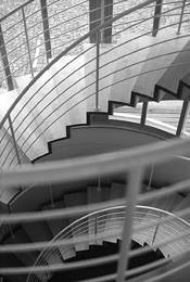 Die Wendeltreppe erschließt je sechs Büros pro Etage über eine lichte „Halle“. Eine Niveaueintiefung an der Gartenseite schafft Tageslicht für Seminar- und Sitzungszimmer im Untergeschoß. (Text: Otto Kapfinger in „Baukunst in Vorarlberg seit 1980, Hrsg. VAI / KUB“)
