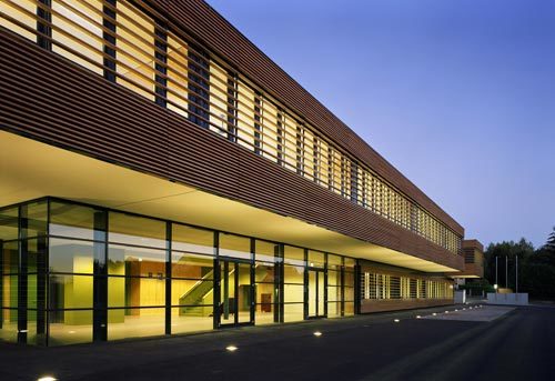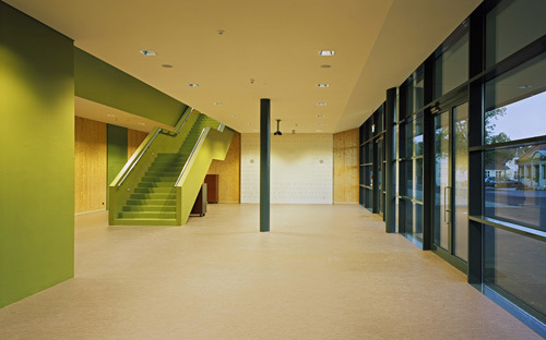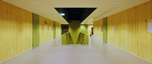 Der neue zweigeschossige Schulbau (Holzelementbauweise auf massiver Stahlbetonbodenplatte, Stahlbetonstiegenhauskern und Liftkern als aussteifende Elemente) fungiert als Bindeglied zwischen innerem Campus und angrenzender Infrastruktur. Richtung Waisenhausstraße setzt die neue Kubatur ein sichtbares Zeichen. Der Eingangsbereich an der Nordwestseite ist durch eine weite Auskragung des Obergeschosses akzentuiert, das an beiden Zugangsseiten großflächig verglaste Foyer gewährt Einblick und darf als Signal einer schulischen Offenheit gewertet werden. Eine freistehende, von oben belichtete Treppe verbindet das Foyer mit den Klassen und Lehrerräumen im Obergeschoss. Eine differenzierte Tageslichtführung in allen Erschließungszonen wertet diese atmosphärisch auf und lässt kleinere und größere Kommunikationsinseln bzw. Rückzugsbereiche entstehen. Auch die Proportionen der Fensterflächen sind in Bezug auf ihre Sommer- und Wintertauglichkeit (Lichteinfall, Beschattung) optimiert. Ein Schulbau mit exemplarischem Charakter: Preise ließen nicht lange auf sich warten. (Text: Gabriele Kaiser)