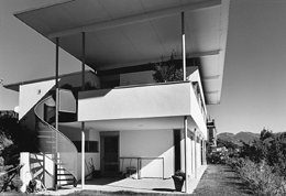 Im gleichen Takt steigen die Dachhöhen bis zum südwärts aufgespreizten, extrem flachen und leichten Pultdach. Südwestseitig in beiden Geschoßen überdeckte Terrassen mit Blick zum Tal und auch westwärts zurück bis zum Säntis. Vorgefertigte Holzdächer, an den Untersichten gelochtes Sperrholz zur Schalldämmung im Terrassenbereich, vorne Stahlstützen und Fensterbänder. (Text: Otto Kapfinger in „Baukunst in Vorarlberg seit 1980, Hrsg. VAI / KUB“)