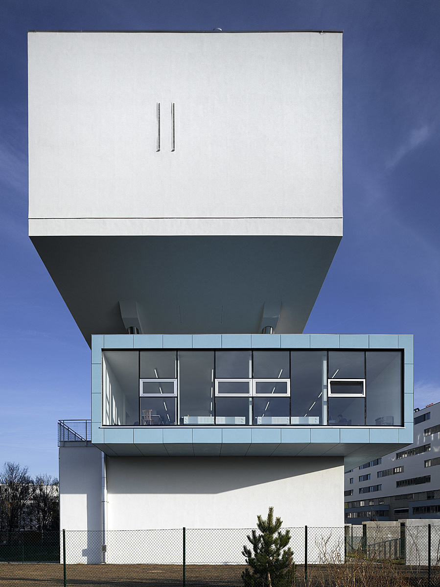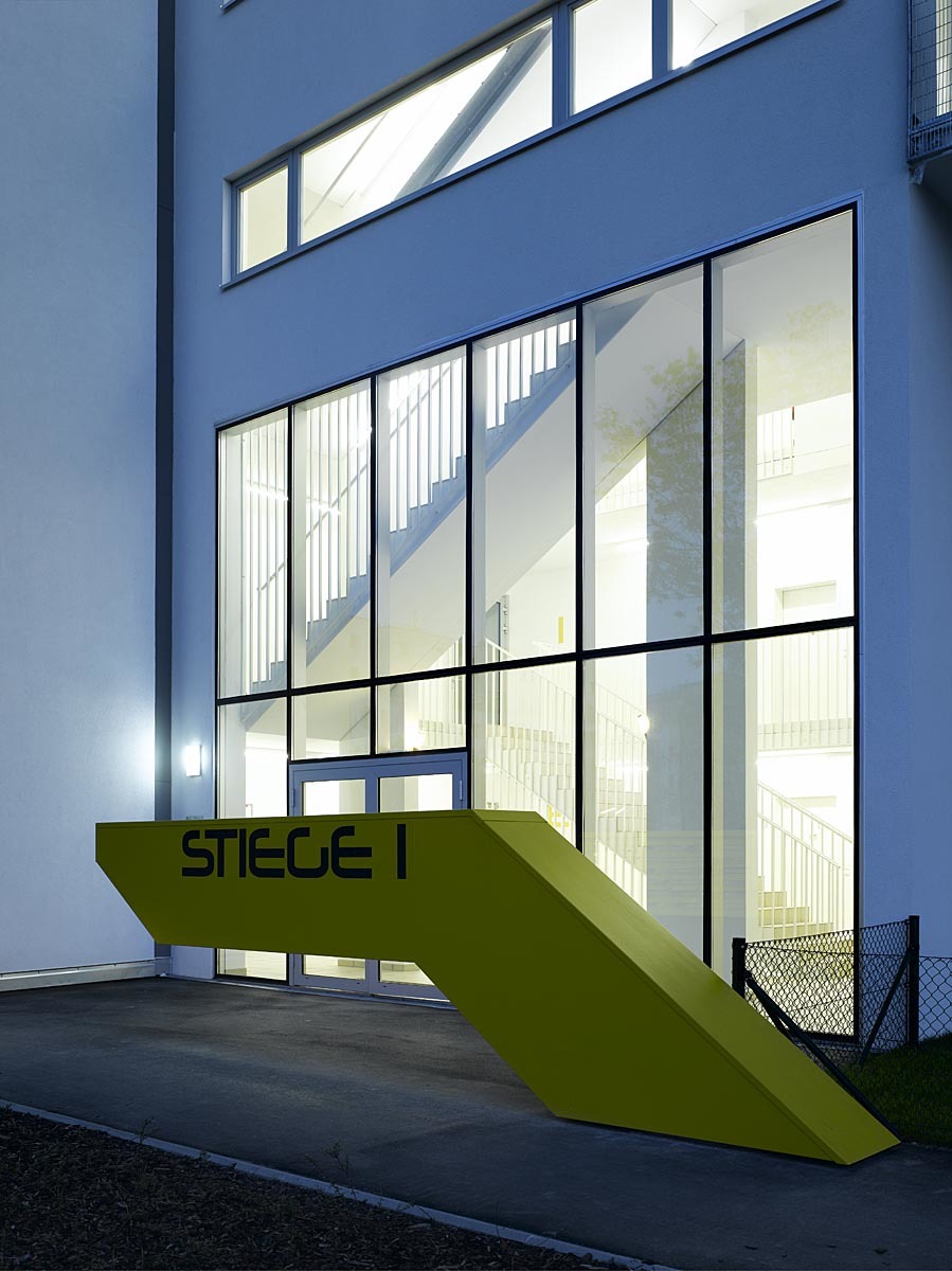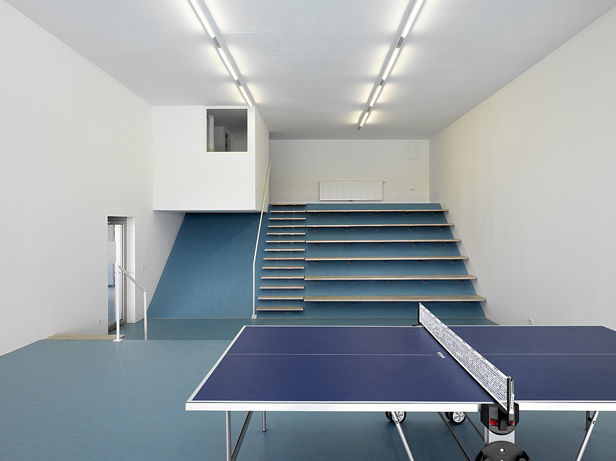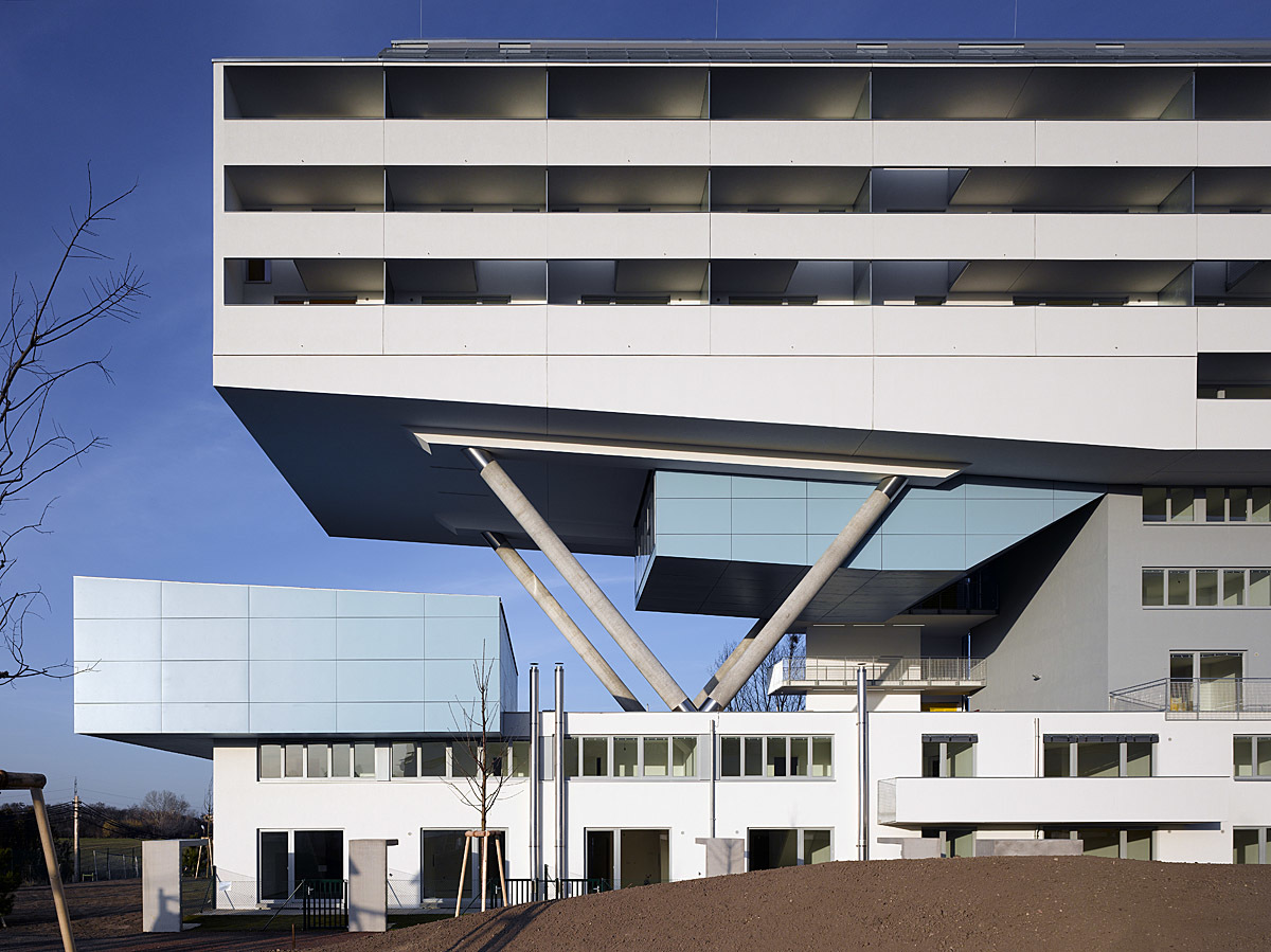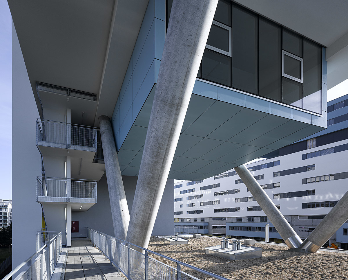 „Ohne Einbußen für die Mieter ist es hier gelungen, eine große Dichte zu erzielen“, sagt Gerda Gerner. Doch je mehr Menschen auf dichtem Raum miteinander leben, desto größer wird das Verlangen nach sozialen und architektonischen Freiräumen. Ans Ende der Nähmaschine addierten Andreas und Gerda Gerner daher zwei Boxen, die sich wie freundliche Parasiten am Gebäude festhalten. Von oben hängt ein Fitnesshaus herab, unten wird ein Gemeinschaftsraum in Schwebe gehalten. Zur baukörperlichen Betonung sind die beiden Zusatzräume in ein hellblaues Eternitkleid gehüllt.