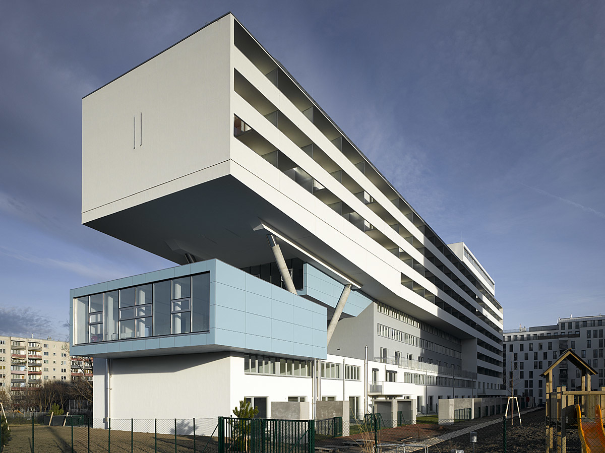 Im Osten gibt sich der zehnstöckige Bau traditionell, im Westen entfliehen die oberen Geschoße dann der Schwerkraft und werden von zwei gigantischen V-Stützen aus Stahlbeton gestützt. Hier liefert die Form Stoff für Gespräche, hier wird der rote Faden gespannt. Doch warum nicht in einer Nähmaschine wohnen? Gerade im Massenwohnbau, bei dem sich in der Regel ein serieller Bau an den anderen reiht, ist jede Art der Identitätsstiftung von hoher Wichtigkeit.