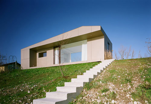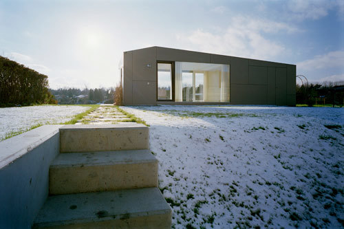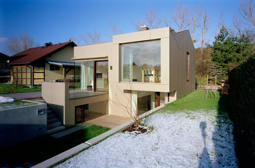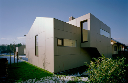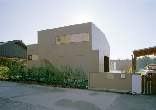 Die Kubatur des kompakten Häuschens für einen 2-Personenhaushalt (Keller: Stahlbetonwanne, EG und OG: Holzriegelkonstruktion/Dübelholzsystembau mit Weichfaserdämmung, Außenhaut: beige Faserzementplatten) spiegelt in gewisser Weise das baubehördliche Reglement, es hat zahlreiche Ausbuchtungen (Erker, Stiegenaufgang, Gaupe), um die Wohnnutzfläche auf legale Weise zu maximieren. Ein Satteldach war sowieso vorgeschrieben, die bebaubare Fläche auf dem 415 m² großen Grundstück sehr klein, selbst für die Farbe des Daches gab es genaue Richtwerte (braun oder dunkelgrau).