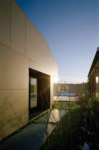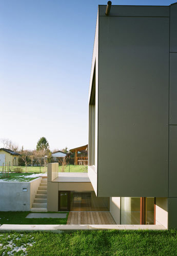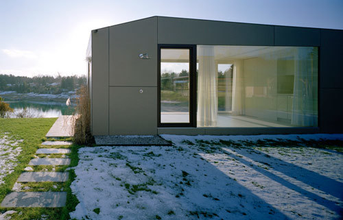 Um das gegliederte Volumen, das sich all diesen Parametern und dem Raumkonzept ergab, als homogenes Ganzes zu fassen, hat sich die Architektin für ein einheitliches Material für Fassade und Dach entschieden und das äußere Strukturbild des Hauses weitgehend minimiert. Um auch auf Kellerniveau ins Freie treten und die Räume ausreichend natürlich belichten zu können, wurde ein Teil des Gartens abgesenkt. Diese Wanne bietet nicht nur die Intimität eines blickgeschützten Gartens, sondern ist auch wegen des starken Windes am Seeufer ein Labsal.