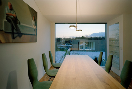 Zur räumlichen Differenzierung und maximalen Ausnutzung der Kubatur wurden die Bereiche mit unterschiedlichen Raumhöhen ausgebildet und miteinander verschränkt. „Das Esszimmer wurde erhöht realisiert“, erläutert Katja Nagy, „um vom Esstisch aus einen Blick auf den See zu haben, da man nicht direkt am See vorne bauen durfte. Dadurch konnte das darunter liegende Schlafzimmer mit einer Raumhöhe von 2,90 m realisiert werden.“ Andere Räume wie Bad, WC oder Eingangsbereich haben dafür nur eine Höhe von 2,10 m. Ein einheitlicher Bodenbelag (Industrieparkett) verstärkt die Verwobenheit der einzelnen Raumbereiche, die schlichte weiße Möblierung sorgt für zusätzliche Großzügigkeit.
