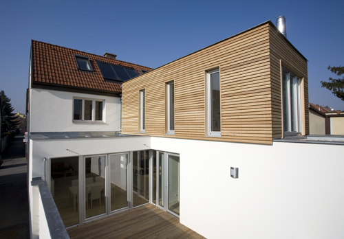 „Es gibt keine Feuermauern und vom Nachbar hört man jedes Husten,“ sagt Sebastian Schmid, der den Umbau plante und sein Büro programmatisch exit-solutions nannte - weil Architektur immer einen Ausweg kenne. Der lag hier im Garten: Die Anlage steht unter Denkmalschutz, an der Straßenseite war daher nichts zu ändern. Sie wurde frisch verputzt, bekam originalgetreue grün-weiße Fenster und Sonnenkollektoren aufs Dach, die genügend Energie zur Warmwasseraufbereitung liefern.