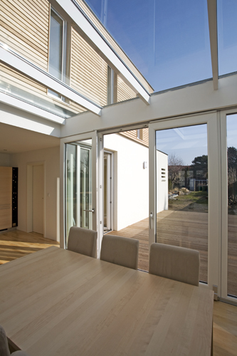 Vor dem Wohnbereich wurde ein Wintergarten mit Glasdach angebaut. Hier sitzt man direkt unterm Himmel an der Terrasse. Die Küche grenzt an den neuen Wirtschaftstrakt, der dem lärchenverkleideten Holzleichtbau darüber als weißer Sockel dient. An einem geräumigen Schrankraum befindet sich oben das Elternschlafzimmer, von dessen Fenster direkt aus dem Bett auf die Bäume im Garten sieht. „Wir wachen mit der Sonne auf und erleben das Licht ganz anders.“
