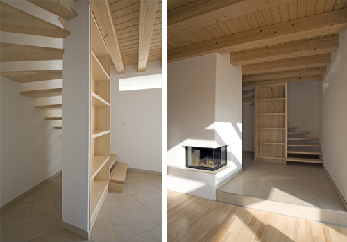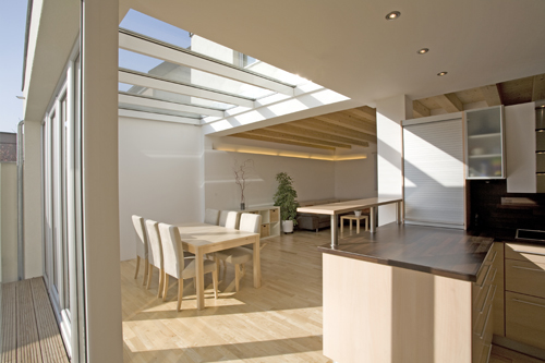 Neben dem Eingang wendelt sich eine leichte, selbsttragende Ahorntreppe um ein 5,60 Meter hohes Regal mit reichlich Stauraumpotenzial. Das Licht, das von oben einfällt, kann zwischen den einzelnen Stufen durchströmen. Auch die Holztramdecke ist neu. Ihre Balken laufen direkt auf den Stahlträger über dem großen Wanddurchbruch zu, der den Wohnraum zum Garten öffnet.