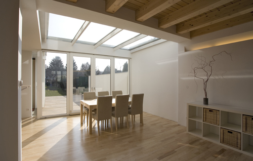 „Im Innenraum waren uns viel Helligkeit und ein warmer Fußboden wichtig“, sagt der Bauherr, der alle Elektroinstallationen in Eigenregie verlegte. In bester Siedlermanier entrümpelte das Paar den Garten, riss alte Dämmungen und Böden heraus, verlegte das schöne Ahornparkett, zog neue Decken ein, montierte Gipskartonplatten und Lärchenlatten. Die Bilanz: „In diesem Haus stecken weit mehr als 1000 Arbeitsstunden.“
