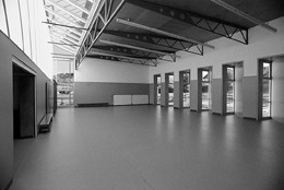 Der Rhythmikraum als größtes Volumen ist an die tiefste Stelle gesetzt, was eine durchgehende Dachlinie und die Einfügung einer Teilunterkellerung im Bereich des Geländesprungs ermöglichte. (Text: Otto Kapfinger in „Baukunst in Vorarlberg seit 1980, Hrsg. VAI / KUB“)