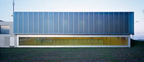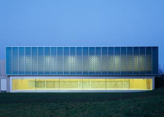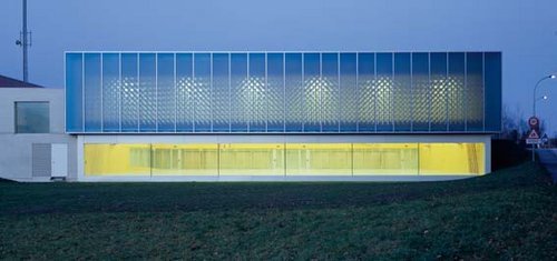 Das Architekturbüro Mann Capua Mann aus Lausanne gewann den Wettbewerb mit einer sorgfältigen und zugleich zweckmäßigen Anordnung, die einen Geländesprung ausnutzt: Der Neubau schließt mit dem Sockel an die bestehende Halle an, das Glasvolumen übernimmt die Fluchten der alten Fassade. Beide Hallen zusammen bilden so am Dorfrand den Abschluss des uneinheitlichen Schulgeländes, auf dem auch ein Technikhaus und eine Mobilfunkantenne stehen. Zwischen dem Anbau und dem gegenüberliegenden Gebäude der Kinderkrippe ist ein neuer, grasbewachsener Platz entstanden. Von hier verlaufen Fußwege zu den Klassentrakten, die von der Straße aus durch Wohngebäude und einen Friedhof verdeckt werden.