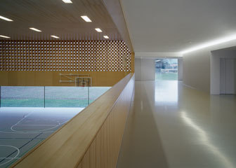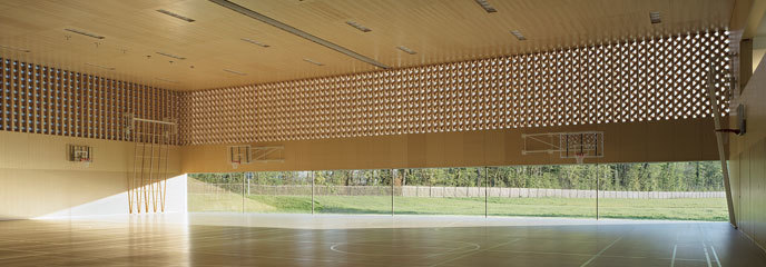 Großen Einfluss auf die Gestalt der Halle hatten auch die Gedanken der Architekten über die künftigen Hauptnutzer, die elf- bis sechzehnjährigen Schüler: »Wir wollten einen ganz mit Holz ausgekleideten Innenraum schaffen, der eine freundliche und beinahe wohnliche Grundstimmung herstellt und einen starken Bezug zur Umgebung hat. Denn Sport ist eine willkommene Abwechslung im Schulbetrieb, aber gerade in der Pubertät stehen die Schüler der Entwicklung des eigenen Körpers noch unsicher und kritisch gegenüber und lehnen die sportliche Betätigung und den Wettstreit oft ab. Ein sinnliches Umfeld mit spannenden Ausblicken kann hier vermittelnd wirken.«