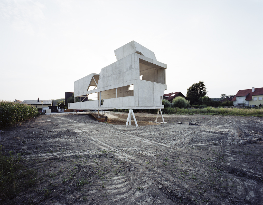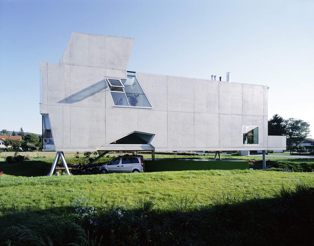Die Familie wünschte sich einen großen, gemeinsamen Raum mit Kochzeile, Kamin und Terrasse. Zwei Jahre arbeiteten Wolfgang Tschapeller, Jesper Bork und Wolfram Mehlem im intensiven Dialog mit den Bauherren an Papier-, Styropor und Computermodellen. Das Resultat ist ein Betonbaukörper, der die gängigen Vorstellungen eines Einfamilienhauses sprengt.