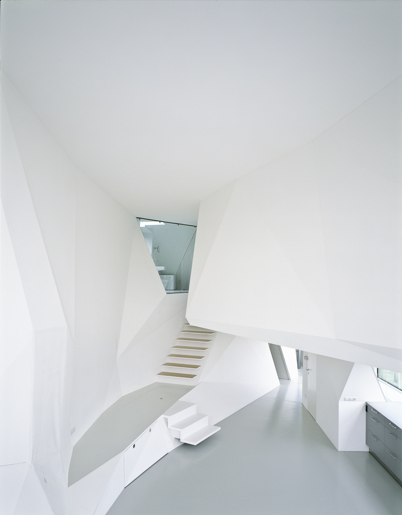 Eine leichte Außentreppe führt an der Südseite zum Eingang, neben dem der gebirgige Wandrücken des Kinderzimmers ansteigt. Wie durch eine Schlucht schlüpft man unter die Decke des abgehängten Schlafraums auf die weite Wohnlichtung, die ganz in Weiß erstrahlt. Wie Kristalle ragen die Zimmer in das offene Innere und verwandeln es in eine bewohnbare Kunstlandschaft. Dahinter verbirgt sich ein polygonales Flächentragwerk aus Holz. Unauffällig verschwindet darin die Stauraumwand mitsamt Kamin. Als dreidimensionale Glaskörper stülpen sich die Fenster über der Küchenzeile aus der Südfassade, frei geformte Fenster durchbrechen die Betonschale und bieten in diversen Körperhaltungen vom Boden bis zur Decke ungeahnte Perspektiven. Mit einer sechs Meter hohen, windverstrebten Glasfront nach Westen scheint der Wohnraum mit dem auskragenden Balkon regelrecht ins Freie zu kippen.