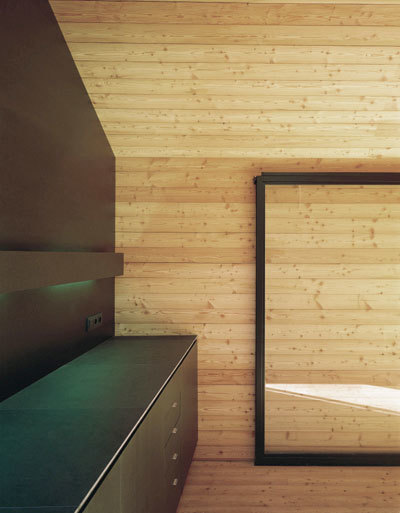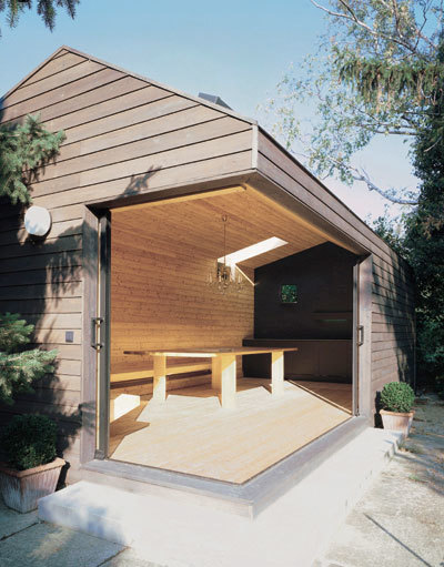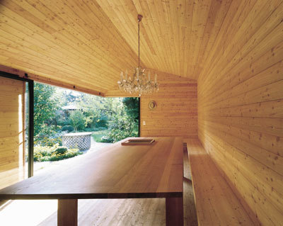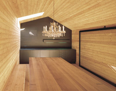 Die Einrichtung – ein großer Massivholztisch und eine dunkle Küchenzeile vor dunkler Stirnwand darf als gediegen „elementar“ bezeichnet werden, für einen Hauch bürgerlicher Üppigkeit sorgt der Kristallluster über dem Tisch. Die Einscheibenverglasung (im schlanken Stahlprofilrahmen) ist komplett übereck öffenbar, der Ausblick bzw. Austritt in den Garten somit ungehindert möglich. Den Blick nach oben, Richtung Himmel, gewährt ein Dachflächenfenster, unter der Sitzbank wurde zudem eine Kirchenbankheizung installiert, die auch in kühleren Jahreszeiten in der Laube für wohlige Wärme sorgt. (Text: Gabriele Kaiser)