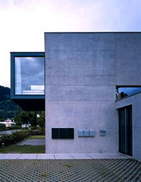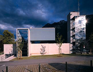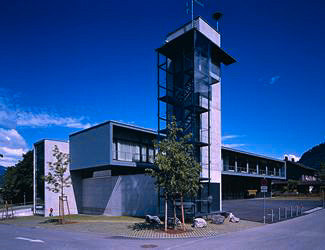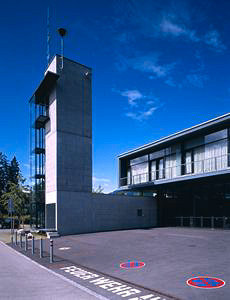 Turm, Rückseite und Seitenfassaden in Sichtbeton; auf die Wagenhalle ist auskragend draufgesetzt die „Schachtel“ der Aufenthalts- und Schulungsräume, farblich differenziert und durch die zurückgesetzte, gläserne SW-Wand sowie das Oberlichtband an der NO-Seite auch bauplastisch herausgehoben. Der Schnitt zeigt die funktionelle Staffelung der Raumhöhen und die damit gegebenen, beidseitigen Belichtungen. (Text: Otto Kapfinger in „Baukunst in Vorarlberg seit 1980, Hrsg. VAI / KUB“)