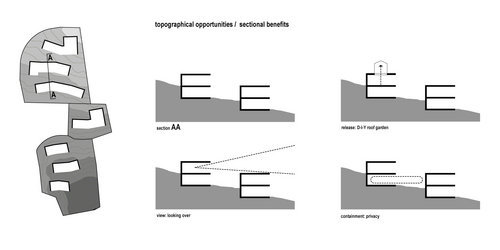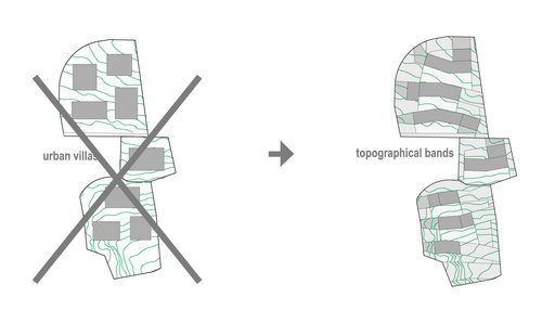 Njiric has deliberately focused on the terrain which, he says, has the power to „reveal speculative forces in their utmost radiance“. Based on the topographic vectors, he draws the footprint of each future block, meanwhile dividing it into lots according to the contours of the land. This results in a rough plan that is further refined by playing with the volumes, and, after few transformations, the footprints start to line up with their plots. The results – low-rise, terraced blocks of housing – are quite interesting and evoke memories of modernist housing estates. The terraced blocks, which follow the natural contours of the land, provide each dwelling with its own ground-level outdoor space as well as a roof terrace. Everything is tied together with a buffer of green consisting of thin green strips and larger areas of green around the blocks that link up with the terraces and private gardens. Apple trees provide a unifying element and an orchard-like atmosphere.