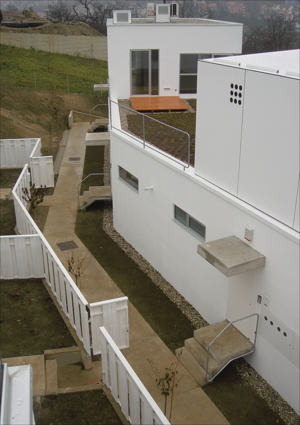 It is against this background that Hrvoje Njiric won first prize in a 2004 competition for a 3000 m² housing development in Gracansko borje, on the outskirts of Gracani. Ever since setting up his architectural practice in 1990, Zagreb-born Njiric´ has been trying to raise the quality of urban development through his many proposals, ideas, competition designs, buildings, urban studies and exhibitions. The architect’s approach here was to find the best strategy for „managing“ the site. His intention to design the entire site rather than simply plonking houses down in the available space is truly noteworthy. The project becomes a composition only when building and site, solid and void, operate together. As such, the non-built areas are a vital element of the whole.