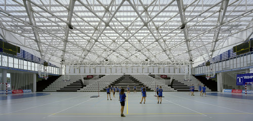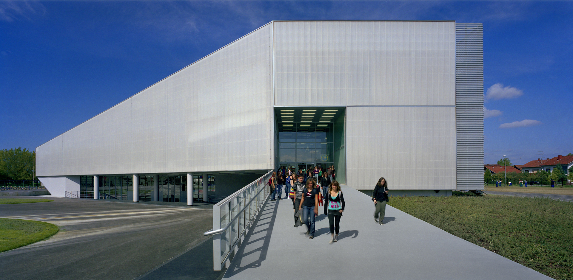 Die Stadt Koprivnica liegt im Norden Kroatiens an der Grenze zu Ungarn in einer Region mit den wenigsten Einwohnern mit Hochschulabschluss. Als Investition in die Zukunft der Region wurde ein Gymnasium für 900 Schüler gebaut, an dem – im Gegensatz zu den meisten kroatischen Schulen – nicht im Zwei-Schicht-System unterrichtet wird, sondern alle Schüler zur selben Zeit anwesend sind. Mit im selben Gebäude befindet sich die Sporthalle die einen Kulminationspunkt der örtlichen Identität darstellt: Koprivnica hat eine lange Handballtradition; der Frauenklub »Podravka« war mehrmals Europameister. Die Doppelfunktion des Komplexes entspricht der zweigeteilten Betreiberschaft einer Public Private Partnership. Die Stadt verwaltet bis 14 Uhr die Schule, danach übernimmt der private Partner die Halle und vermietet sie an externe Benutzer.Lea Pelivan und Toma Pleić gewannen den 2003 ausgelobten Wettbewerb und gründeten daraufhin das gemeinsame Büro Studio Up. Kernpunkt ihres Entwurfes ist das zentrale Erschließungselement, ein Flurbereich, der als sozialer Mittelpunkt fungiert, genauso wie die Hauptstraßen der sich in der pannonischen Ebene oft kilometerlang in die Länge ziehenden Dörfer.