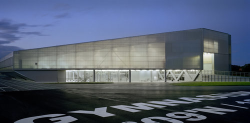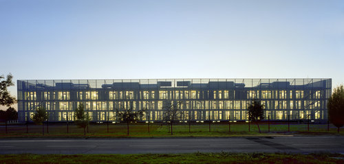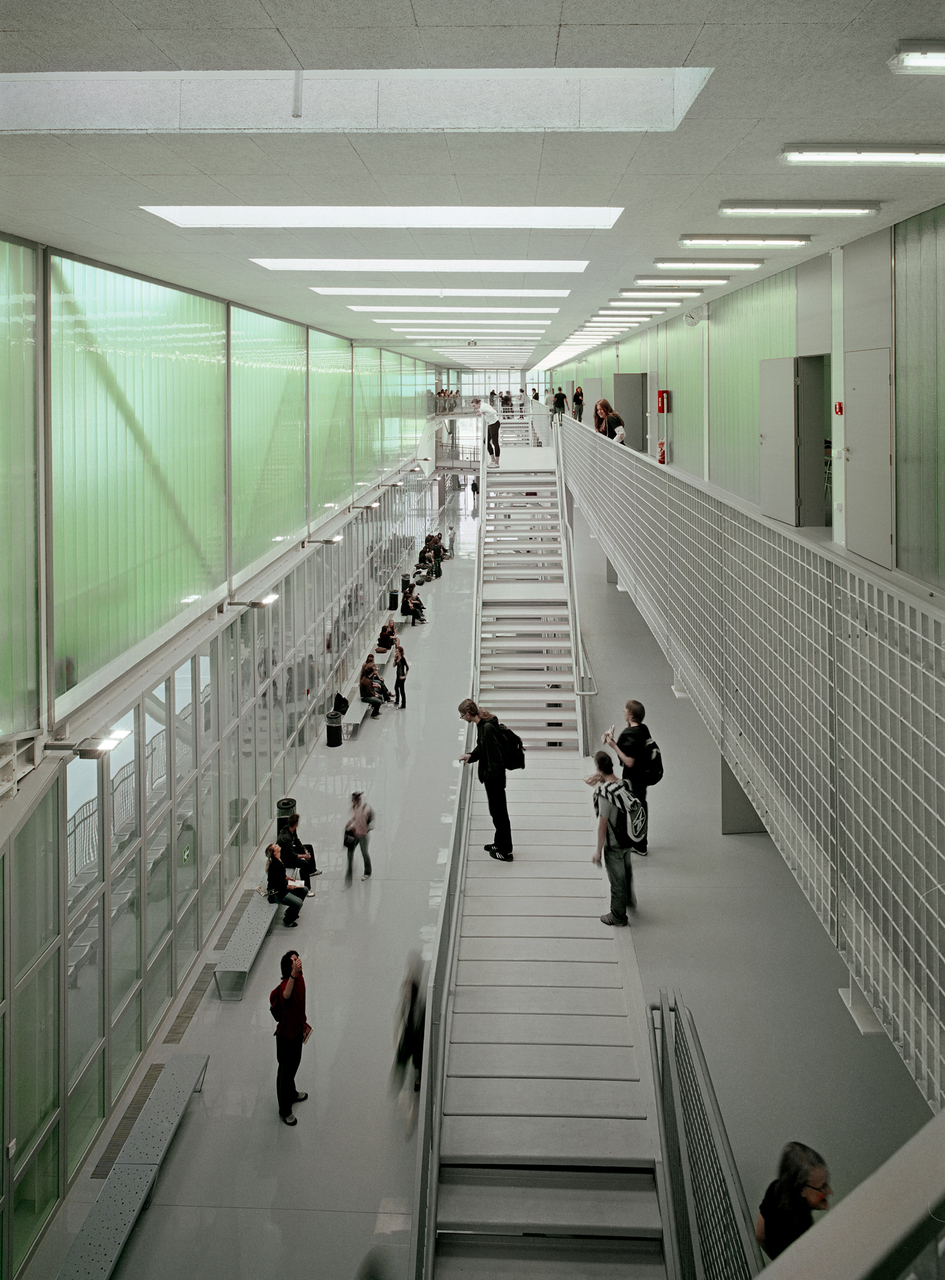 An der Trennlinie zwischen den beiden Gebäudefunktionen treffen unterschiedliche Qualitäten aufeinander. Das Geistige stößt an das Körperliche, Beschaulichkeit trifft auf Betriebsamkeit, der klaren äußeren Struktur steht das Auf und Ab verschiedener Aufgänge und Brücken im Inneren gegenüber. Der Komplex wirkt wie eine komprimierte Stadt mitten auf dem Land, deren transluzente Hülle das vielfältige Innenleben offenbart. Die harte äußere Form wird aufgeweicht, verhüllt nichts, ist offen, demokratisch – einfach städtisch. (Text: Robert J. Loher)