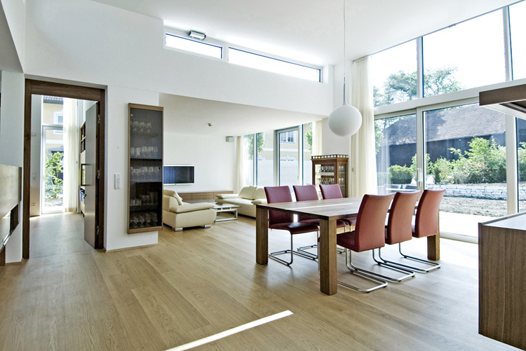 „Wir waren der Meinung, dass trotz der räumlichen Nähe zum Betrieb eine gewisse Privatsphäre gewahrt bleiben sollte“, sagt Architektin Elisabeth Lobmaier. An den beiden Schmalseiten zur Straße und zum Betrieb hin ist das Gebäude daher abgeschottet. „Wir haben auch darauf geachtet, dass man das Gebäude von der Zufahrt aus kaum wahrnimmt“, ergänzt Markus Lobmaier und erklärt damit die Ausrichtung des Gebäudes. Großflächig öffnet sich der Bau lediglich nach Osten und Westen, wo der große Garten liegt.
