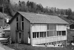 Die Wendeltreppe steht frei im Hauszentrum. Die innere Raumgliederung ist offen, neutral und streng symmetrisch mit zwei Kaminen samt Öfen als Brennpunkte. Im OG sind die Südzimmer verbunden über einen brückenartigen Balkon, der den Luftraum zwischen Veranda und Stiege durchkreuzt. Die Firstverglasung fügt der komplexen Vertikalachse des Hauses noch das Zenitlicht hinzu. (Text: Otto Kapfinger in „Baukunst in Vorarlberg seit 1980, Hrsg. VAI / KUB“)