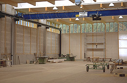 Eine sehr helle, leichte, rasch montierte Halle von 16 x 45 m, von der Firma selbst als Demonstration modernen Ingenieurholzbaus detailliert und gefertigt, dient als Anbau an die bestehende Substanz