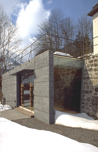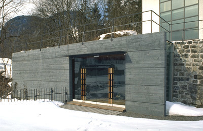 Den seitlichen Spalt zum Bestand schließt eine Mattglaswand, die den Innenraum belichtet und zugleich am Abend als Leuchtwand nach außen wirkt. (Text: Otto Kapfinger in „Baukunst in Vorarlberg seit 1980, Hrsg. VAI / KUB“)