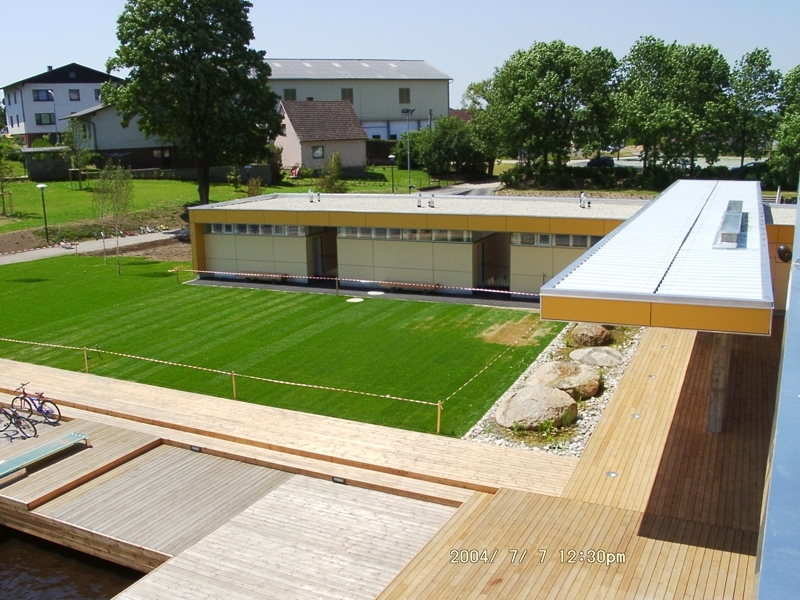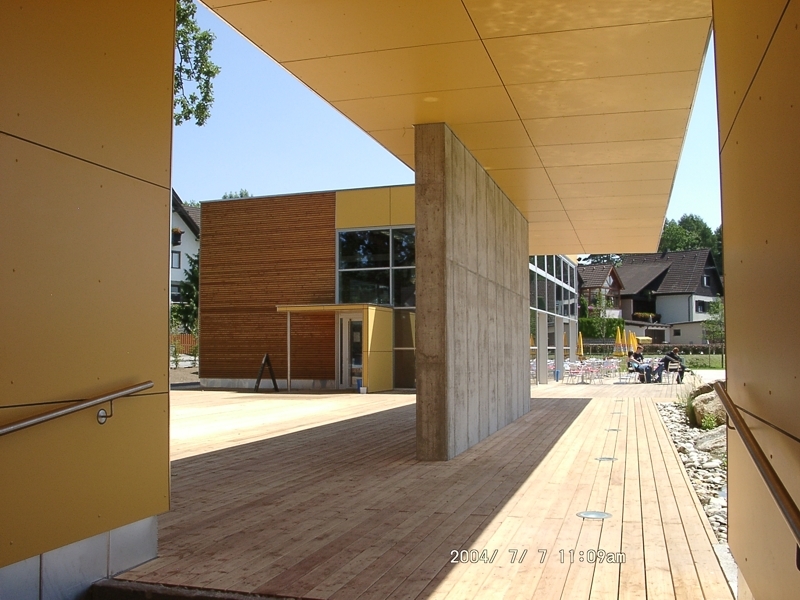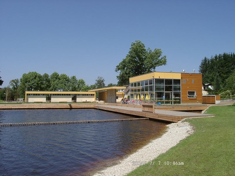 Die Hochbauten mit ihrer klaren Formensprache grenzen den holzgedeckten Vorplatz, den Badebereich und den asphaltierten Sportplatz voneinander ab und ermöglichen gleichzeitig interessante Durchblicke. Das Restaurant mit der Terrasse über dem Wasser bietet einen attraktiven Ausblick auf das gesamte Moorbadgelände und bildet den neuen Mittelpunkt der Anlage.