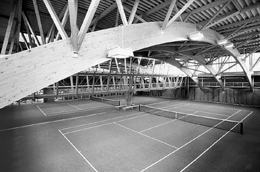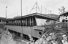 Auf den Bogenbindern abgestützt ein Netz von horizontalen Deckenbalken, die durch Spannstahl ausgesteift werden. Darüber Trapezblech als Innenansicht der Dachhaut. Zugänge und Zuschauerplätze rundum auf erhöhten Tribünen, verbunden durch eine abgehängte Galeriebrücke. Fensterband rundum unter den Traufen, zur abgeböschten Nordseite auch ebenerdige Glasflächen. (Text: Otto Kapfinger in „Baukunst in Vorarlberg seit 1980, Hrsg. VAI / KUB“)
