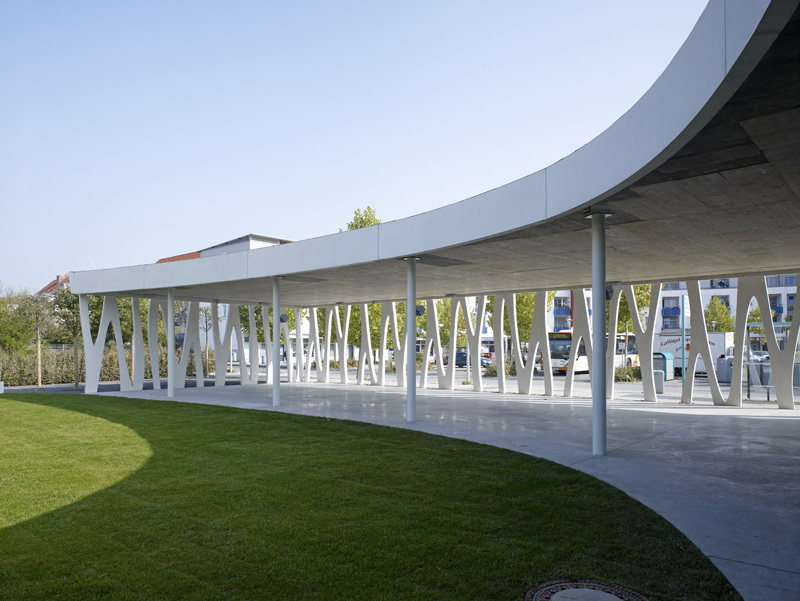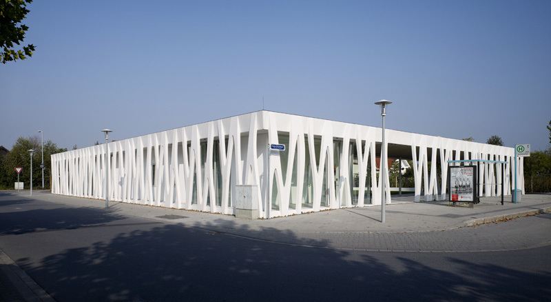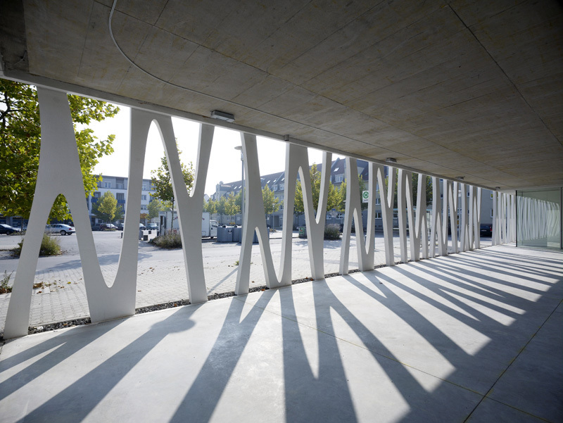 Surrounded by a row of upright supports that recall plants, the community centre attracts passers-by, offering views of the interior and what lies beyond. It is set around a semi-public garden courtyard; rather than shutting itself off from its mundane surroundings, the structure of meeting hall, meeting rooms and youth centre seeks contact. The eye-catching, load-bearing outer shell consists of two basic modules: prefabricated unclad concrete components that could be installed either way up, and an all-round glass facade. The perfectly moulded concrete parts with their sophisticated geometry called for experienced and extraordinarily precise production, supplied by a manufacturer located some 200 km away.