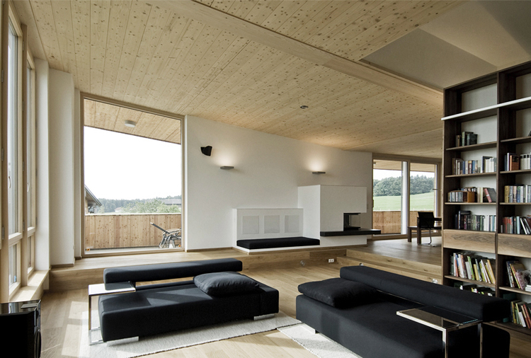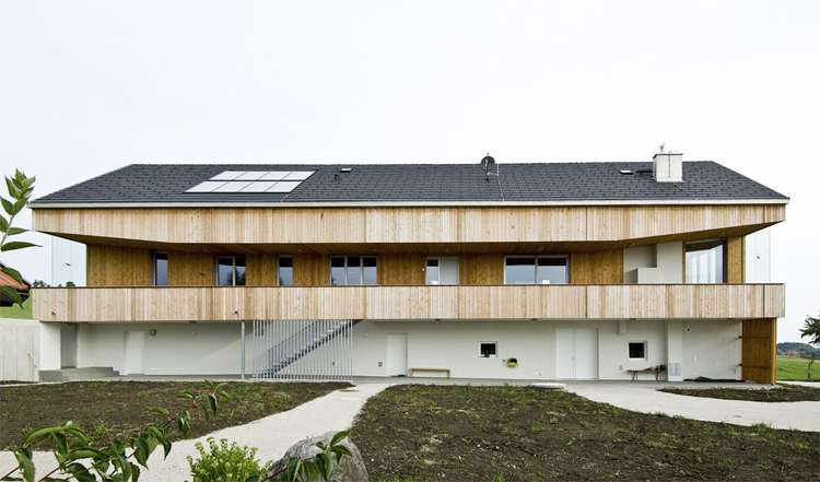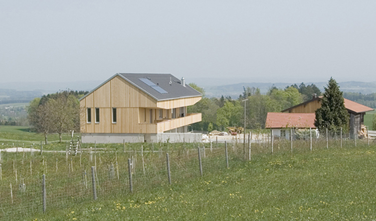 Der Baukörper ist in den weitläufigen Fluss des Hanges eingefügt, die bestimmenden Bezüge der regionalen Gebäudetypologie - hohe, langgestreckte Satteldachgebäude mit seitlichem Überdach werden aufgenommen und weiterentwickelt.Der Dialog zwischen Gebäude und aufsteigender wie abfallender Landschaft ist entwurfsbestimmend. Die seitlichen Schrägen sind außen wie innen durchgezogen und resultieren in schräg nach oben sich öffnende Innen- und Außenräume. Diese den Raum und das Gebäude dynamisierende Linie nimmt ihren Anfang in der Konstruktion und ist bis zu der Loggia und den Außenfassaden durchgestaltet. Die Wohnebene entwickelt sich von den Rückzugsbereichen im Nordwesten, die sich zur geborgenen Hangseite öffnen, hin zum loftigen, höhenmäßig differenzierten Wohnbereich, der sich trichterförmig der Talseite und damit der Alpenlandschaft und seinen Bewohnern zuwendet. Architekten