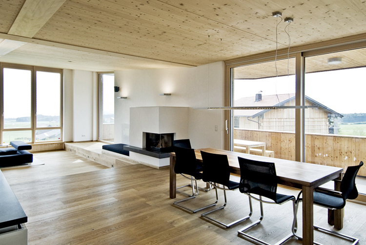 Über dem bestehenden Erdgeschoß liegt eine offene Wohnebene mit südseitiger Loggia, die durch das Alpenpanorama bestimmt ist.