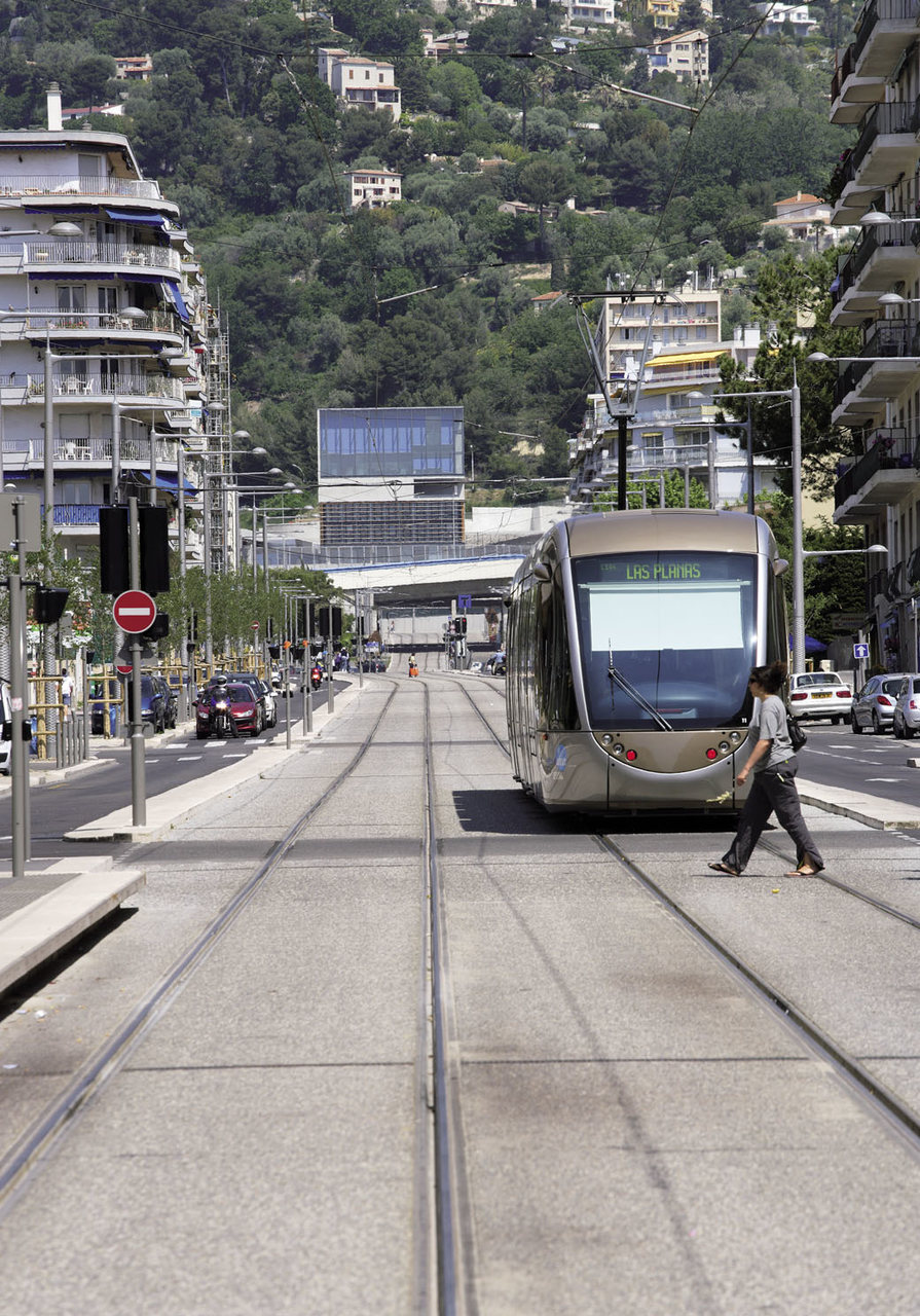 Die vom Meer zurückgesetzten Stadtteile von Nizza liegen meist an Hängen. Die Linie 1 mit den silbernen Niederflurbahnen der „Communauté d’Agglomération Nice Côte d’Azur“ führt von Norden einen Hügel hinunter in das Zentrum, erreicht hier westlich des alten Hafens fast die Promenade des Anglais und verläuft dann am Boulevard Jean Jaurès entlang des gedeckelten Flusses Paillon, macht einen Schwenk nach Osten zur Universität an der Rue Maréchal Vauban und führt dann wieder ein Stück nach Norden (Seite 27). Die Endhaltestelle Pont Michel liegt im Stadtgebiet „Bon Voyage“; von hier bietet sich ein imposanter Blick hinauf zum Mont-Gros, auf dem sich die 1880–92 erbaute Sternwarte des Pariser Opern-Architekten Charles Garnier erhebt, mit einer Kuppel von Gustave Eiffel. Eine Verlängerung der Linie bis zum Krankenhaus Pasteur und später den Fluss Paillon entlang in die nordöstlich gelegenen Vororte ist vorgesehen. Eine zweite und dritte Linie werden folgen; die Linie 2 soll „in zweiter Reihe“ entlang der Bucht durch die Stadt verlaufen und im Westen bis zum Flughafen und weiter nach Cagnes-sur-Mer führen. Die deutlich kürzere Linie 3 ganz im Westen von Nizza wird das Stadtentwicklungsgebiet in der Ebene längs des Flusses Var erschließen. Die Planungen gehen davon aus, dass schon 2020 das komplette Netz auf 36 Kilometer Länge fertig sein wird, doch gibt es bereits jetzt erhebliche Verzögerungen beim Projekt der Linie 2, da die Kosten stetig steigen und es nun auch noch Überlegungen gibt, die Strecke direkt entlang der Promenade des Anglais zu führen, um dieser damit wieder eine größere Bedeutung zu schenken. Außerdem sorgen einige Geschäftsleute der Stadt, die angesichts der zu erwartenden großen Baustellen um Einbußen fürchten, dafür, dass sich die Entscheidungen hinziehen.