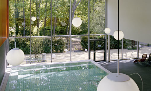 Der dunkle Hintergrund des Waldes hilft der räumlichen Inszenierung des Ausblicks – beispielsweise vom Massagebecken – unterschiedliche Aspekte der neuen Bepflanzung hervorzuheben.