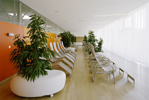 4) Die durch die Garderobenanlagen des alten Freibades entstehende Hofsituation im Westen wird durch die Anlage der neuen Sonnenterrasse und des darüber liegenden Wintergartens gestärkt