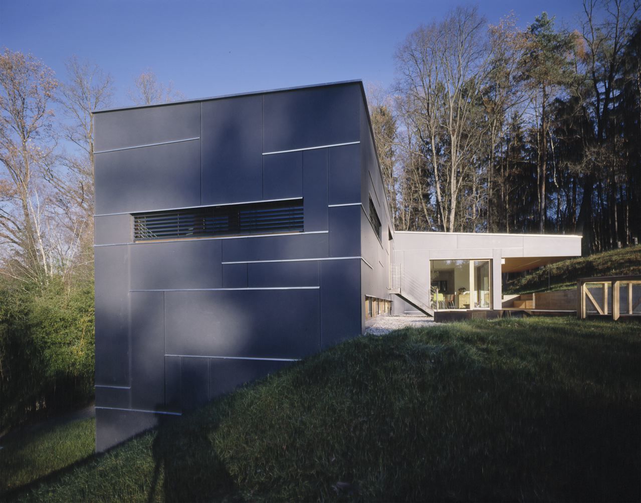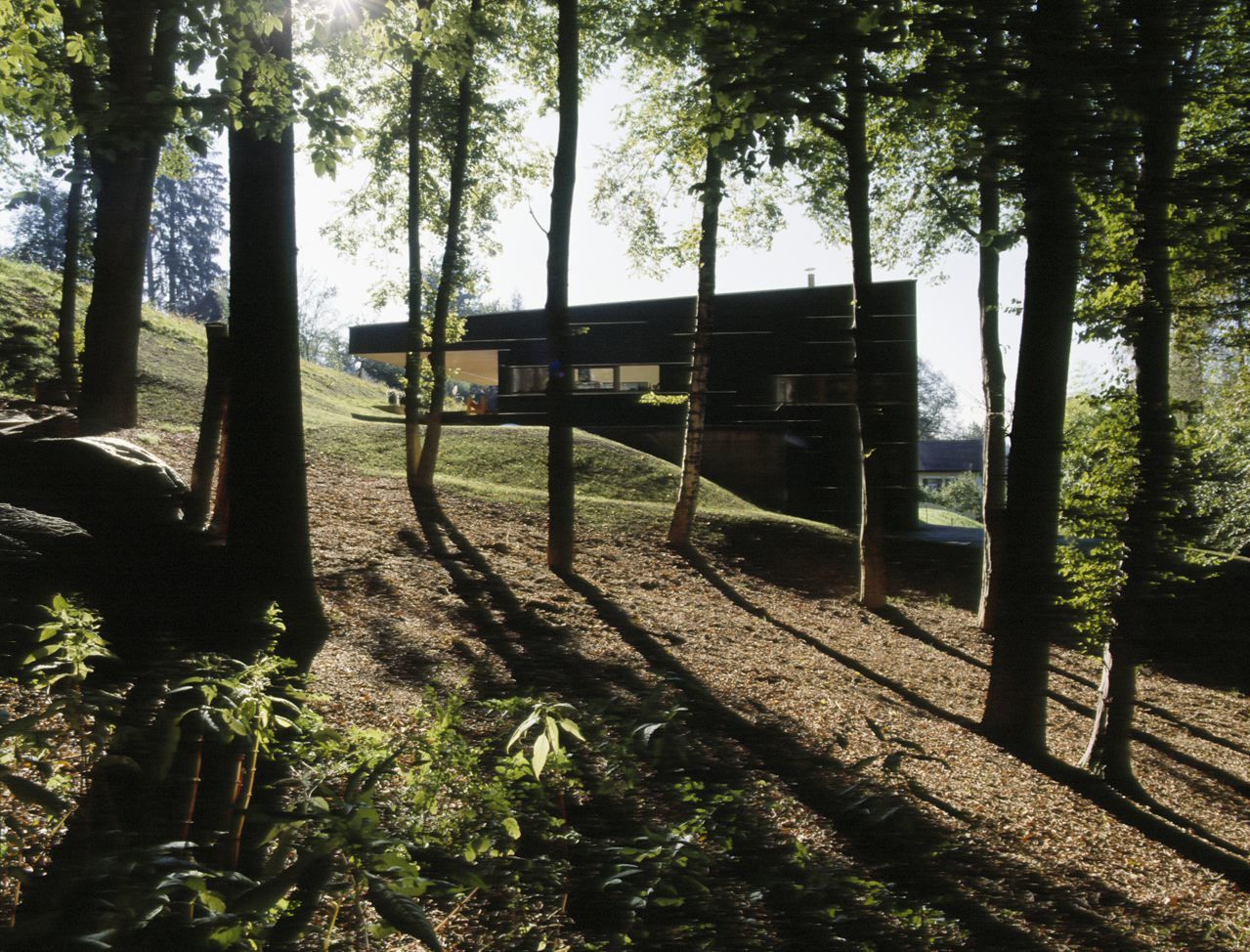 Im Eingangsgeschoss befinden sich die Schlafräume mit Badezimmer, der Arbeitsraum und die Haustechnik. In den nach Norden orientierten Schlafräumen schaffen Oberlichter einen Bezug zum rückwärtigen, höher gelegenen Garten und gewährleisten zusätzlich eine Belichtung von der Südseite. Der großzügige Wohn- und Essbereich mit Küche und Zugang zu Garten und Terrasse befindet sich im Obergeschoss. Von hier aus wird eine höher gelegene dritte Ebene erschlossen, in der das Elternschlafzimmer mit Bad sowie das Kinderzimmer liegt. Durch diesen Niveausprung wird im Wohnbereich eine größere Raumhöhe erzielt. Im Haus gibt es vielfältige Rückzugsbereiche mit interessanten Belichtungssituationen und differenzierten Ausblicken in die Natur.