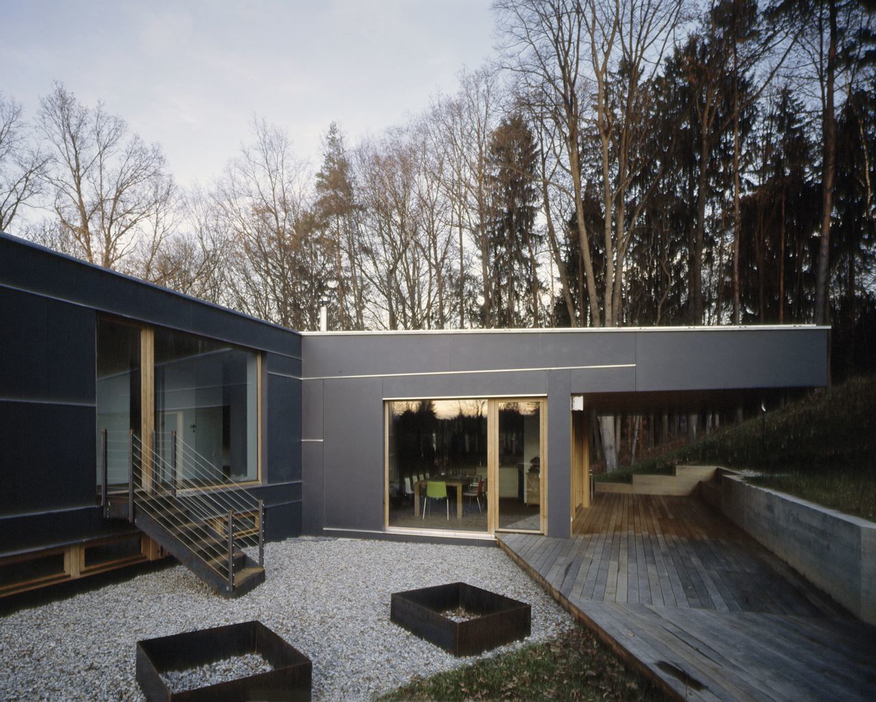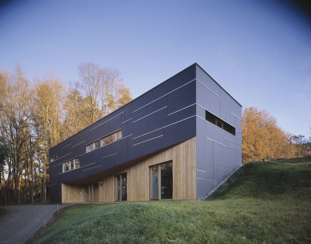 Die Fassade besteht aus unterschiedlich großen schwarzen Eternittafeln, bei der die Horizontalfugen mit Aluminiumtropfblechen gegliedert sind. Diese dienen gleichzeitig auch als Fensterbänke. Die Vertikalfugen in drei unterschiedlichen Breiten sind schwarz hinterlegt. Die in den Baukörper eingeschnittenen Fassadenflächen sind – ebenso wie die Fenster – in Eichenholz ausgeführt. Die Fassadentafeln sind unterschiedlich groß, wodurch das Fugenbild, verstärkt durch die hellen Linien der Aluminiumprofile, zum bestimmenden Gestaltungsmerkmal des Äußeren wird. Die Fenster fügen sich präzise in dieses Raster ein.
