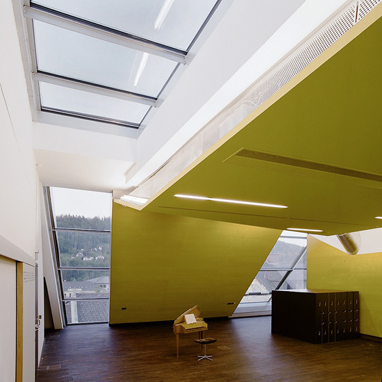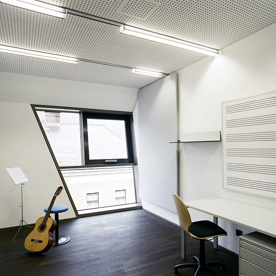 In den beiden über der Hinterbühne befindlichen neuen Obergeschoßen, erhält die Musikschule ein neues attraktives Hauptquartier mit unterschiedlich großen Musikunterrichtsräumen, einem Verwaltungsbereich und einem Orchesterprobesaal im Dachgeschoß.
